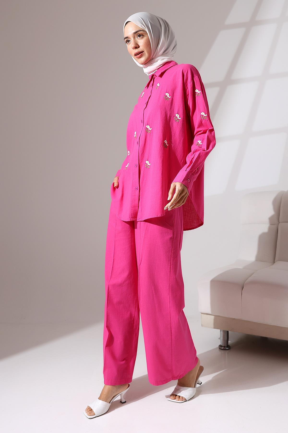 100% Pamuk Keten Günlük ve Rahat Çiçek Desen Nakışlı Gömlek Pantolon Yazlık Alt Üst Takım