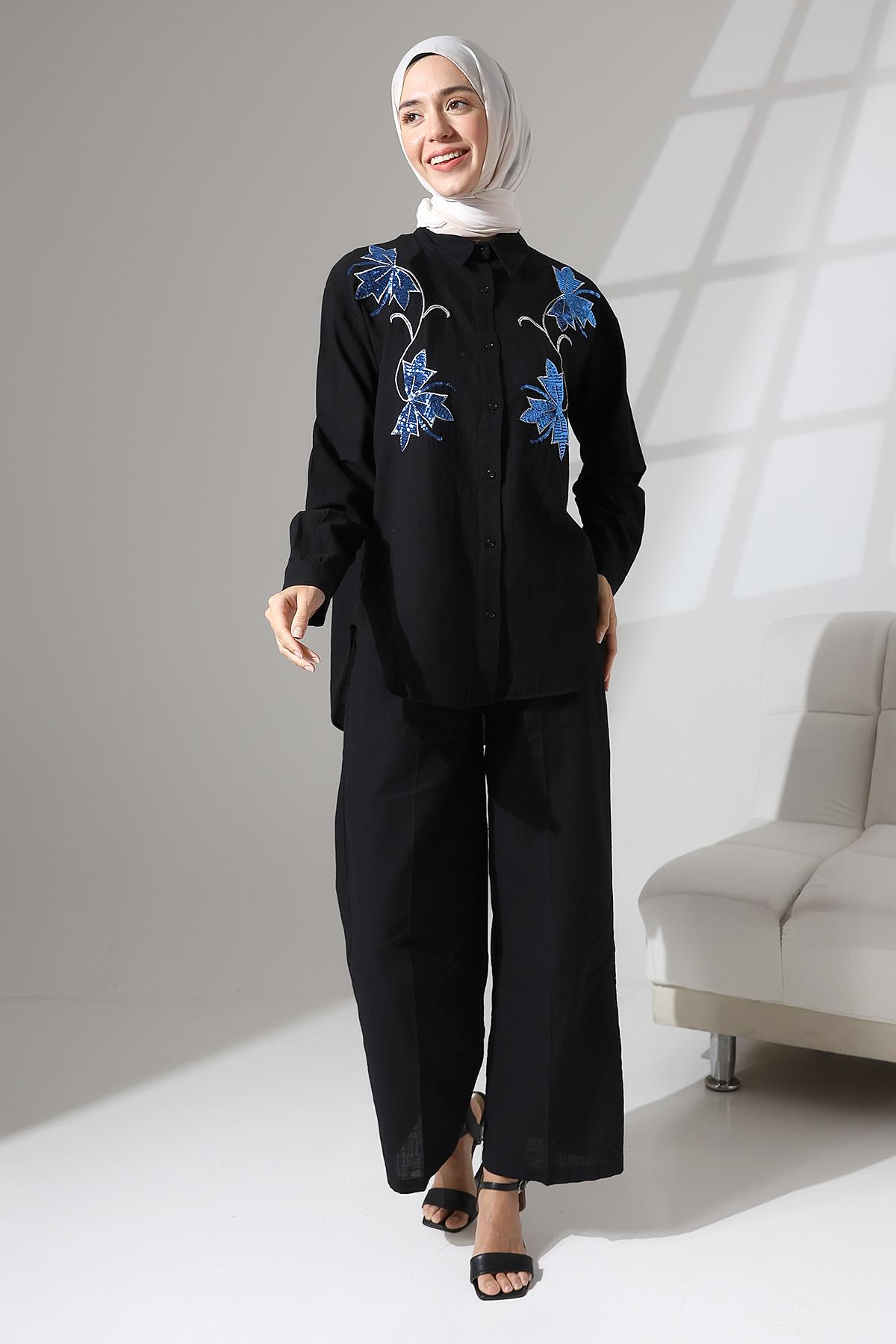 100% Pamuk Keten Günlük ve Rahat Çiçek Desen Nakışlı Pullu Gömlek Pantolon Yazlık Alt Üst Takım
