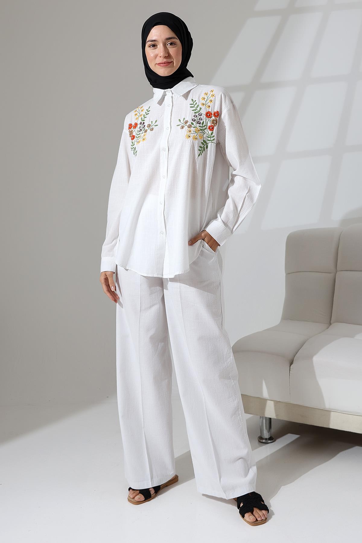 100% Pamuk Keten Günlük ve Rahat Çiçek Desen Nakışlı Taşlı Gömlek Pantolon Yazlık Alt Üst Takım