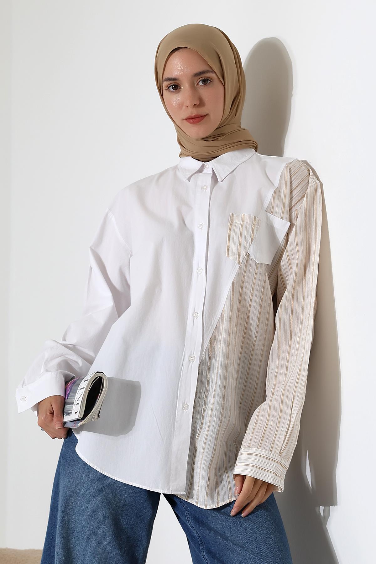 Mihran Butik’in kadın 100% pamuk poplin kumaş tesettür gömleği, hafif ve nefes alabilen yapısıyla dört mevsim rahatlık sunar.; 100% pamuk poplin kumaşı ve pamuk dokuma garni detayı sayesinde doğal bir his uyandıran bu gömlek, şıklık ve konforu bir arada arayanlar için ideal bir seçenektir.; İç göstermeyen özelliği, düğme kapamalı tasarımı, klasik ve zarif bir duruş sağlarken, regular fit rahat kalıbı günlük kullanıma uygun bir konfor sunar.; S-M ve L-XL olmak üzere iki farklı beden seçeneği bulunan gömleğin uzunluğu S-M beden için 82 cm, L-XL beden için 84 cm olup, S-M beden 55-70 kg, L-XL beden ise 71-90 kg aralığı için uygundur.; Şık tasarımıyla günlük kombinlerden iş hayatına kadar geniş bir kullanım alanı sunan bu tesettür gömlek, buz mavisi, kahverengi, siyah, pembe ve mavi renk seçenekleriyle her tarza hitap eder.; Fotoğraftaki manken 175 cm boyunda olup, 84 cm göğüs, 63 cm bel ve 90 cm basen ölçülerine sahiptir ve S-M beden giymektedir.; Hem rahat hem de şık bir görünüm sunan bu gömlek, gardırobunuzun vazgeçilmez parçalarından biri olmaya adaydır.