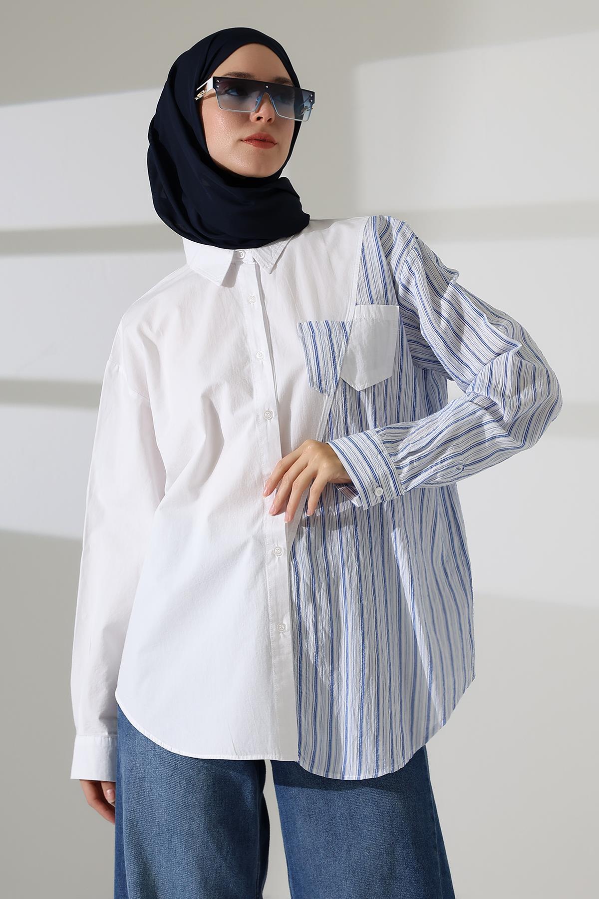Kadın 100% Pamuk Poplin Kumaş Mavi Tesettür Gömlek