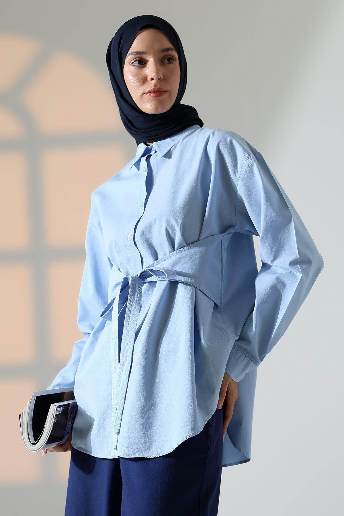 Kadın 100% Pamuk Poplin Kumaş Mavi Tesettür Gömlek