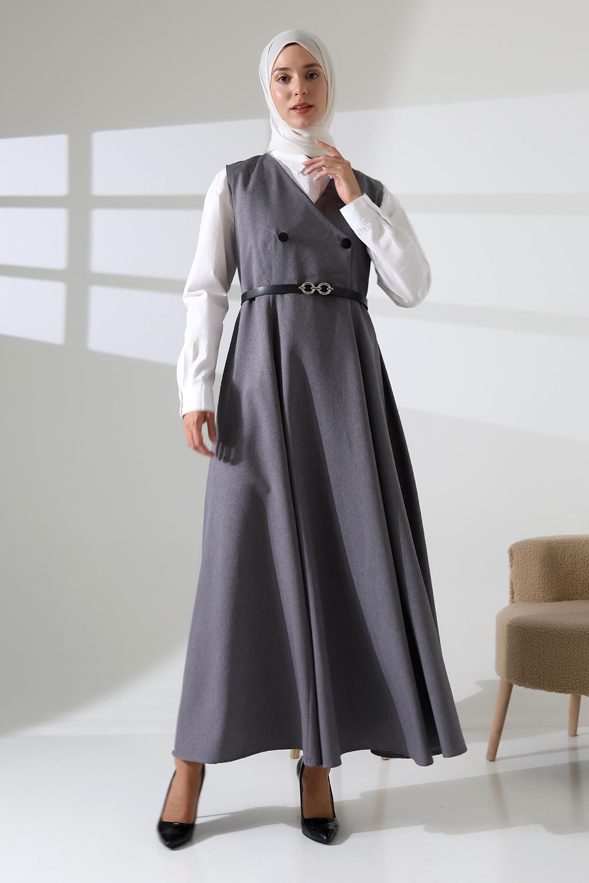 Kadın Dokuma Düğmeli Kemerli Antresit Jile Elbise