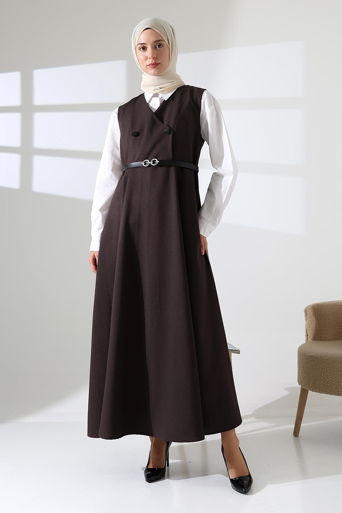 Kadın Dokuma Düğmeli Kemerli Kahverengi Jile Elbise