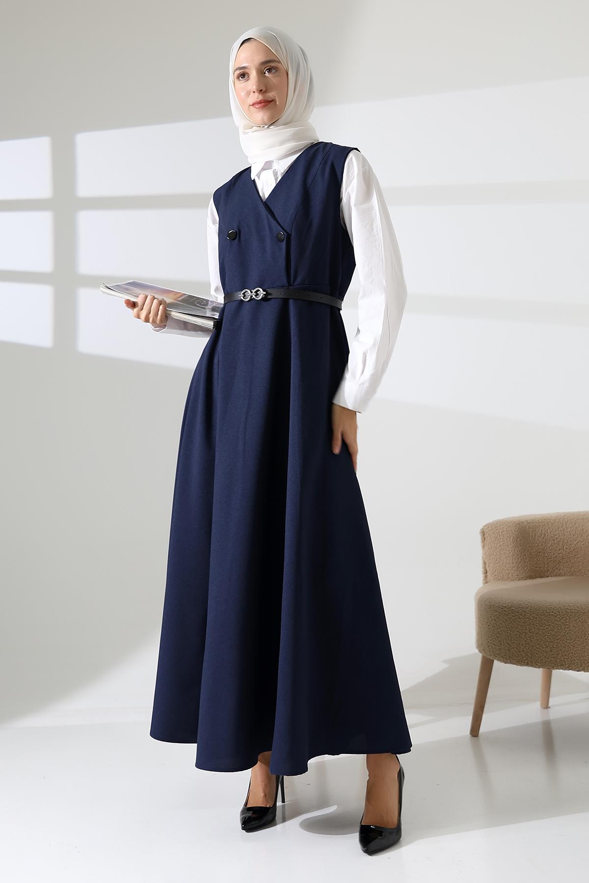 Kadın Dokuma Düğmeli Kemerli Lacivert Jile Elbise