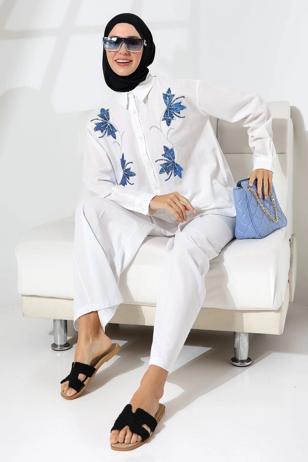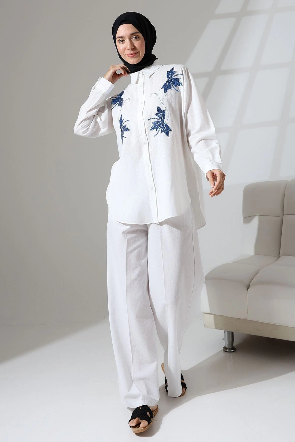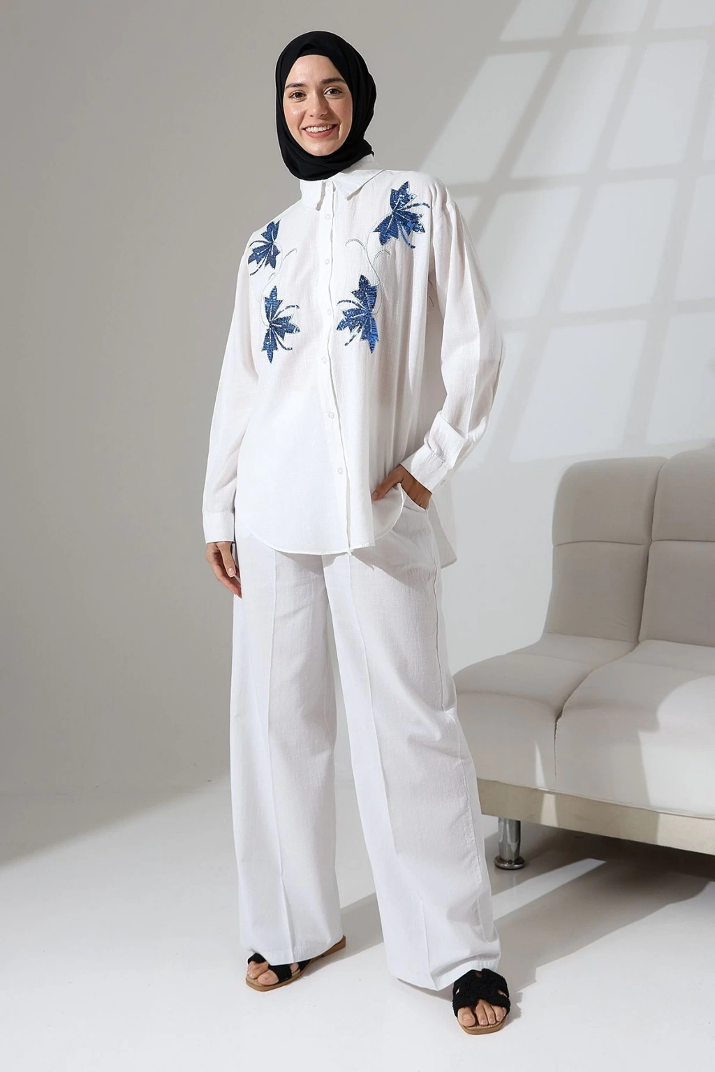 100% Pamuk Keten Günlük ve Rahat Çiçek Desen Nakışlı Pullu Gömlek Pantolon Yazlık Alt Üst Takım