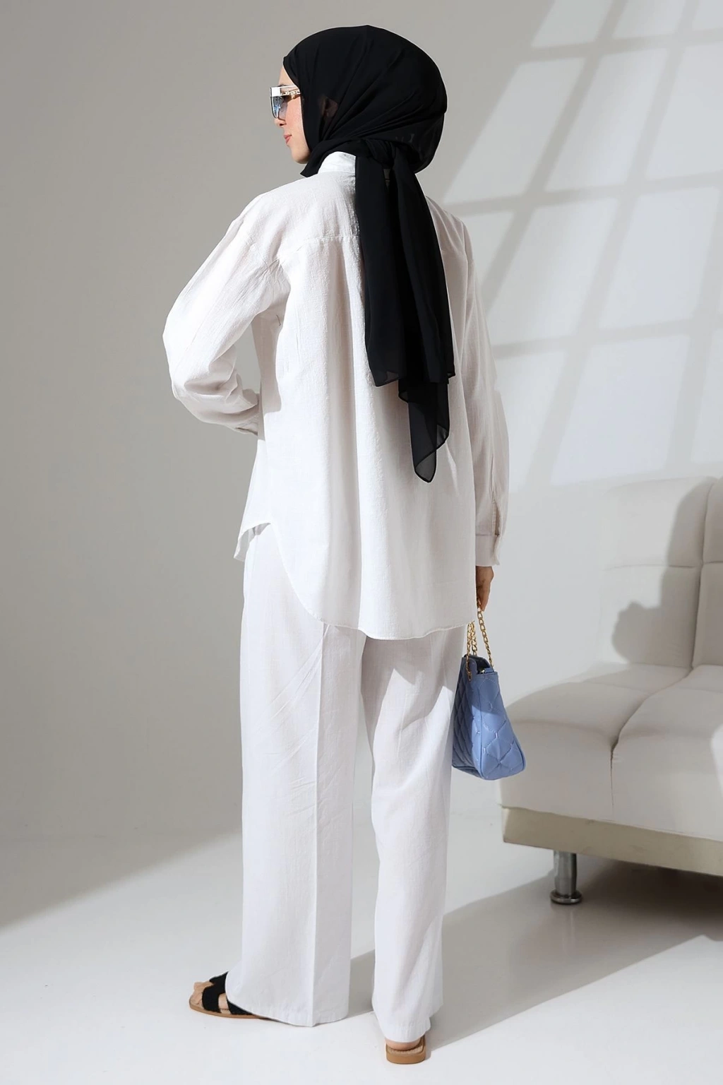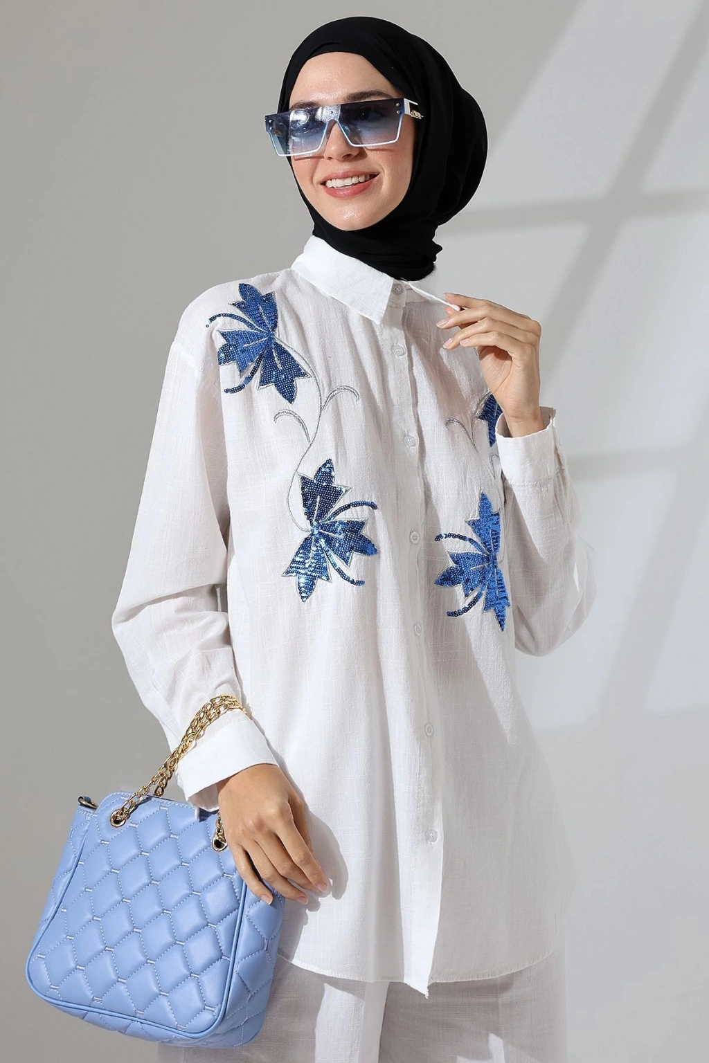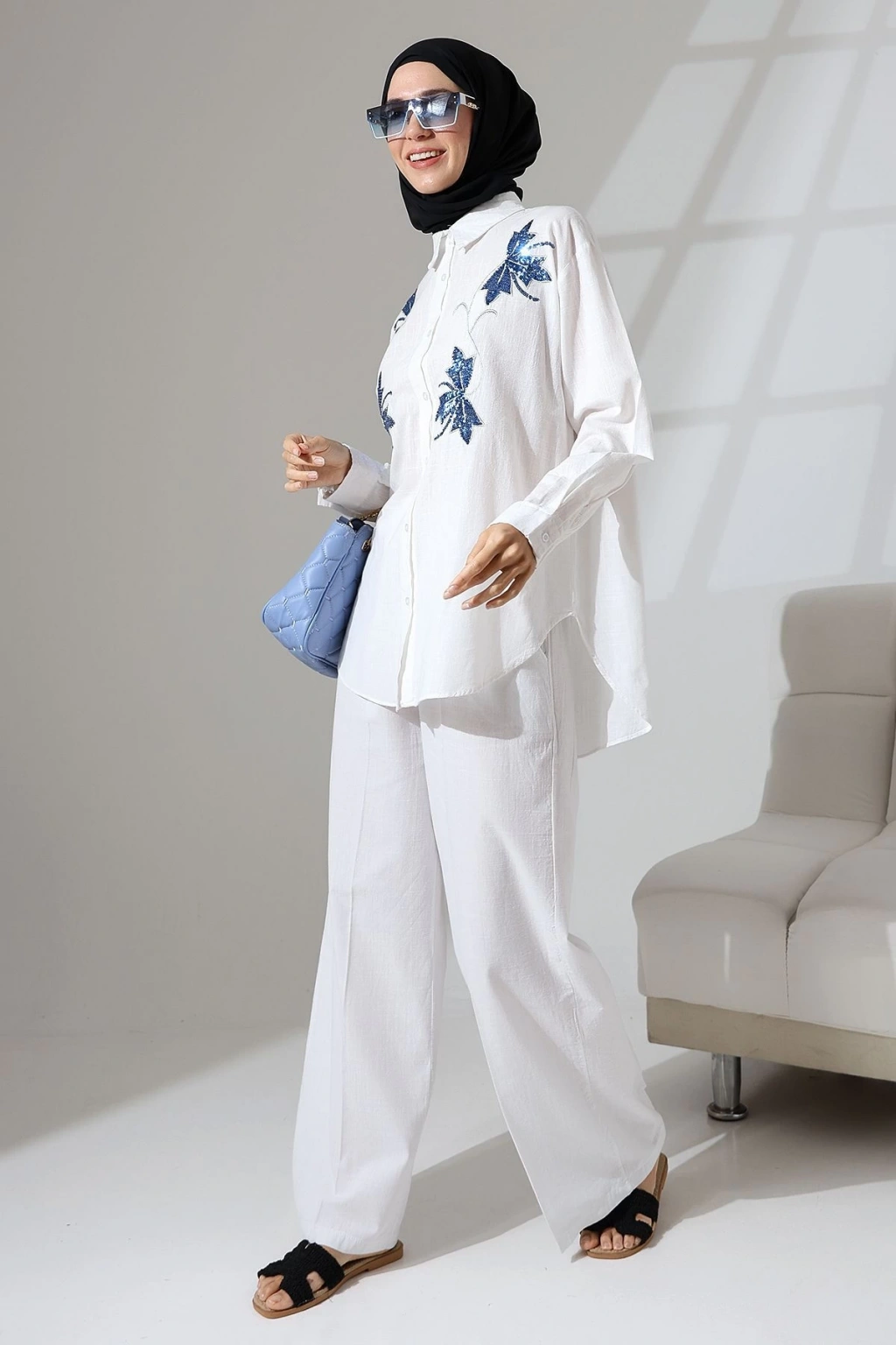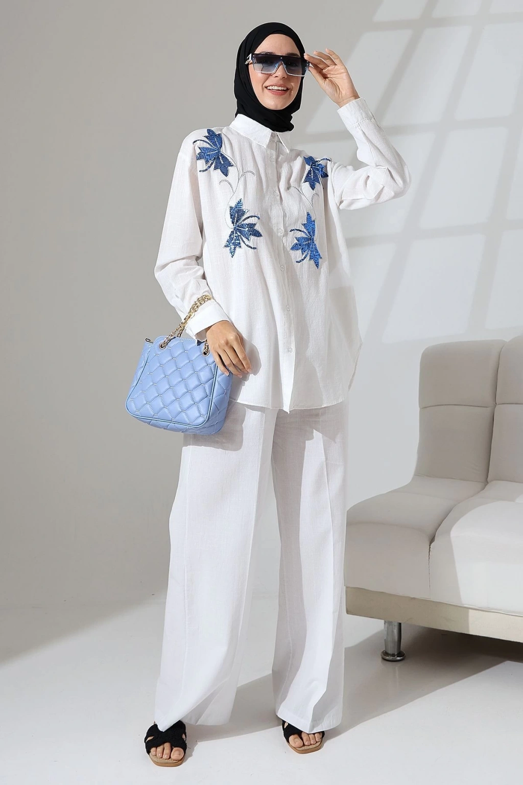 100% Pamuk Keten Günlük ve Rahat Çiçek Desen Nakışlı Pullu Gömlek Pantolon Yazlık Alt Üst Takım