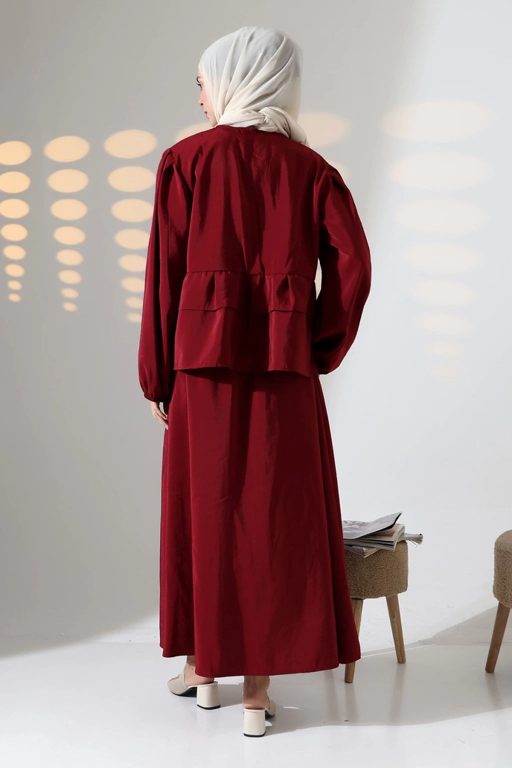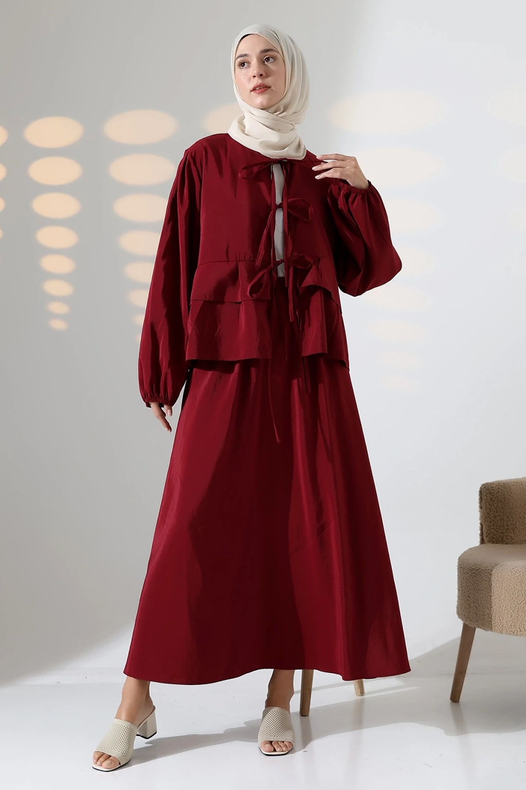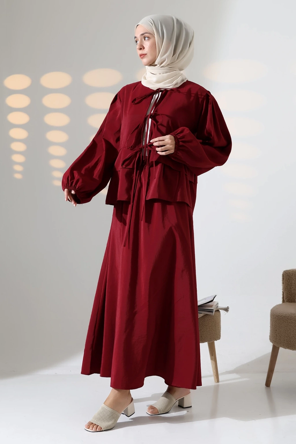Mihran Butik’in kadın 100% pamuk modal gömlek etek tesettür takımı, zarif tasarımı ve doğal kumaş dokusuyla günlük şıklığınızı tamamlıyor.; 100% pamuk modal dokuma kumaştan üretilen takım, dört mevsim kullanım için uygundur.; Gömlek balon kol tasarımı, fiyonk bağlama detayı ve bileklerdeki lastik yapısıyla şıklığı ve konforu bir arada sunar.; Eteğin beli lastikli olarak tasarlanmış olup, rahat hareket etmenizi sağlar.; S-M ve L-XL beden seçenekleriyle sunulan takımda, S-M beden için gömlek göğüs ölçüsü 55 cm ve uzunluğu 62 cm; L-XL beden için göğüs ölçüsü 59 cm ve uzunluğu 63 cm’dir.; Her iki beden için eteğin uzunluğu 100 cm’dir.; Beden önerisi olarak, S-M beden 55-70 kg; L-XL beden 71-90 kg arasındaki kullanıcılar için uygundur.; Regular kalıp yapısıyla vücuda rahat bir oturuş sunan bu takım, beyaz, bordo, gri, haki, kahverengi ve krem renk seçenekleriyle satışa sunulmaktadır.; Fotoğraftaki mankenin boyu 175 cm, göğüs 84 cm, bel 63 cm, basen ölçüsü 90 cm olup, üzerindeki ürün S-M bedendir.; Stüdyo çekimlerinde ışık farkından dolayı renklerde ton farklılıkları oluşabilir.