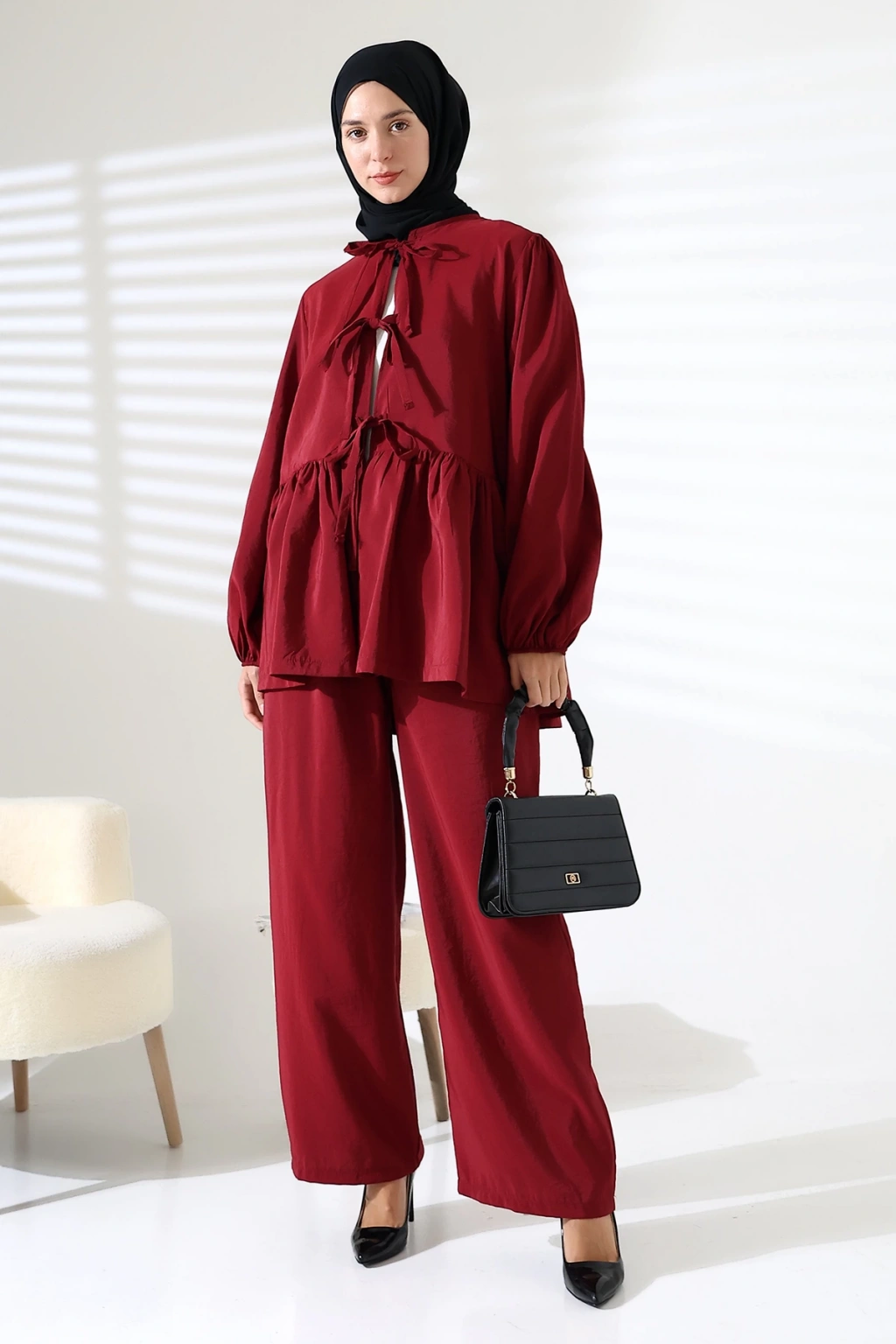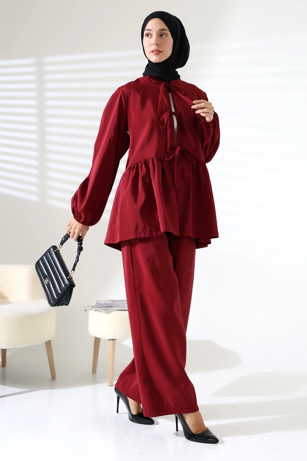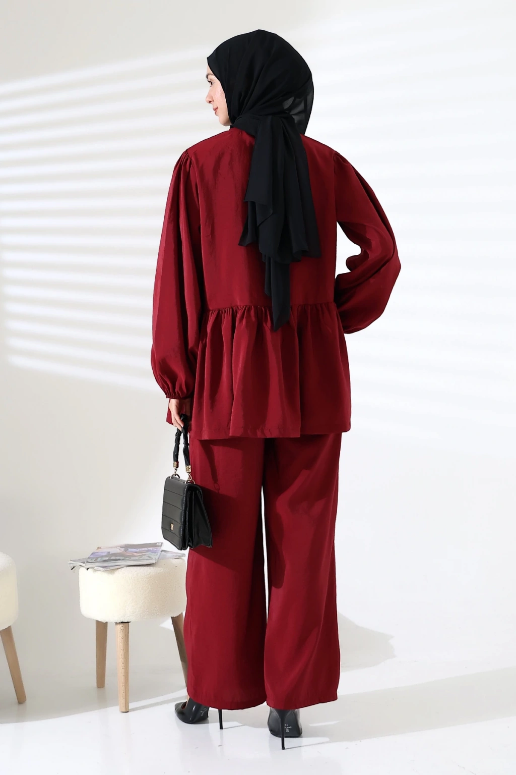 Kadın 100% Pamuk Modal Bordo Gömlek Pantolon Tesettür Takım