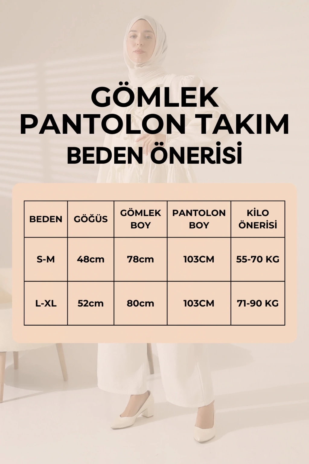 Mihran Butik in kadın %100 pamuk modal gömlek pantolon tesettür takımı, hafif ve nefes alabilir yapısıyla dört mevsim boyunca rahatlıkla tercih edilebilecek bir tasarıma sahiptir.; Fiyonk bağlamalı ve balon kollu sıfır yaka gömleği, modern bir görünüm sunarken aynı zamanda zarif detaylarla dikkat çeker.; Pantolon lastikli beli ve çift cepli yapısıyla günlük kullanımda konfor sağlar.; S-M ve L-XL beden seçeneklerine sahip olan takımın ölçüleri, S-M beden için göğüs 48 cm, gömlek uzunluğu 78 cm ve pantolon uzunluğu 103 cm; L-XL beden için ise göğüs 52 cm, gömlek uzunluğu 80 cm ve pantolon uzunluğu 103 cm olarak belirlenmiştir.; Beden önerisi olarak S-M beden 55-70 kg, L-XL beden ise 71-90 kg arası kullanıcılar için uygundur.; Regular fit kalıbıyla şıklığı ve rahatlığı bir arada sunar.; Ürün, beyaz, bordo, gri, haki, kahverengi, lacivert, siyah ve taş olmak üzere geniş bir renk yelpazesine sahiptir.; Fotoğraftaki mankenin boyu 175 cm, göğüs 84 cm, bel 63 cm, basen 90 cm olup, giydiği beden S-M dir.; Stüdyo çekimlerinde renkler ışık farklılığından dolayı değişiklik gösterebilir.