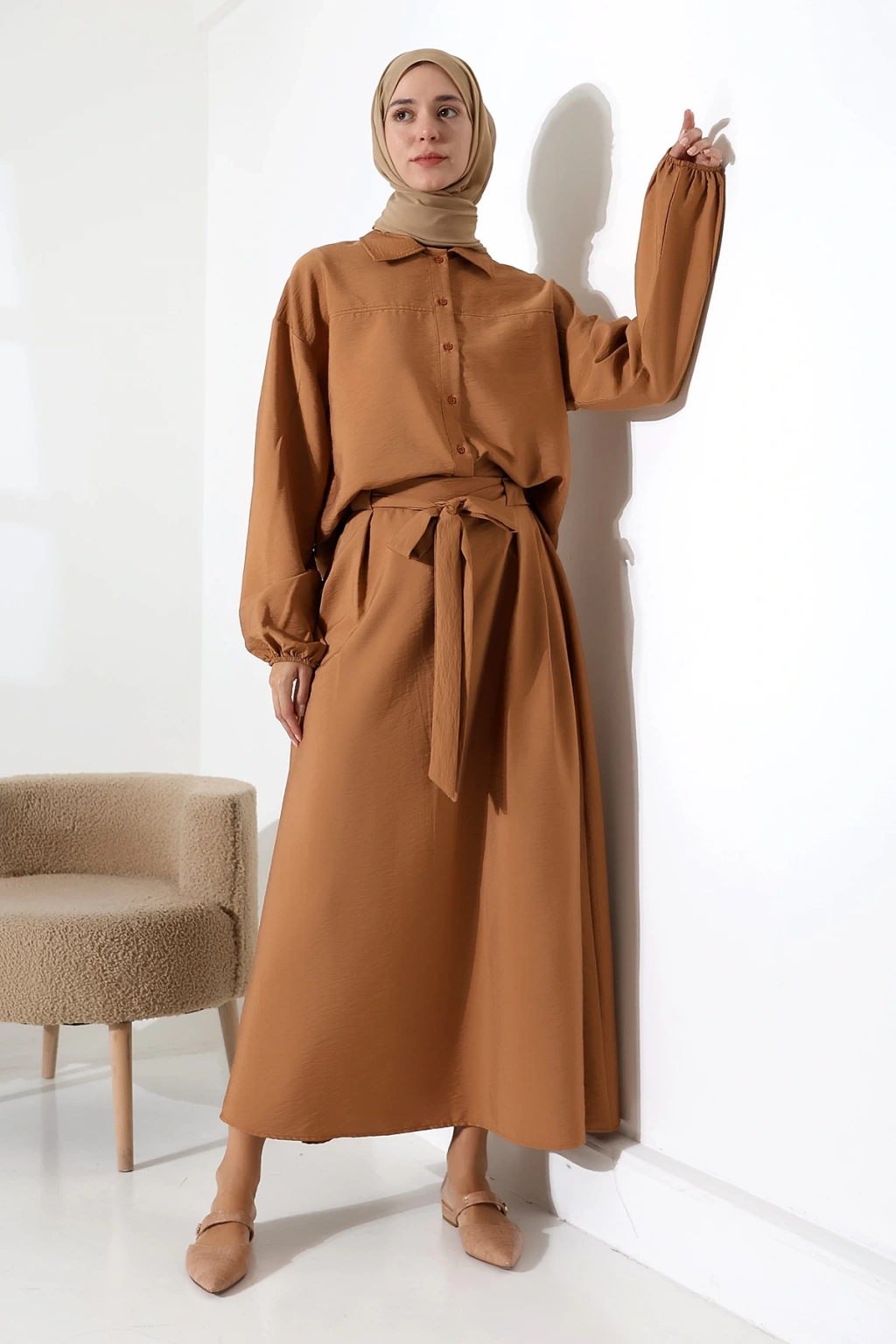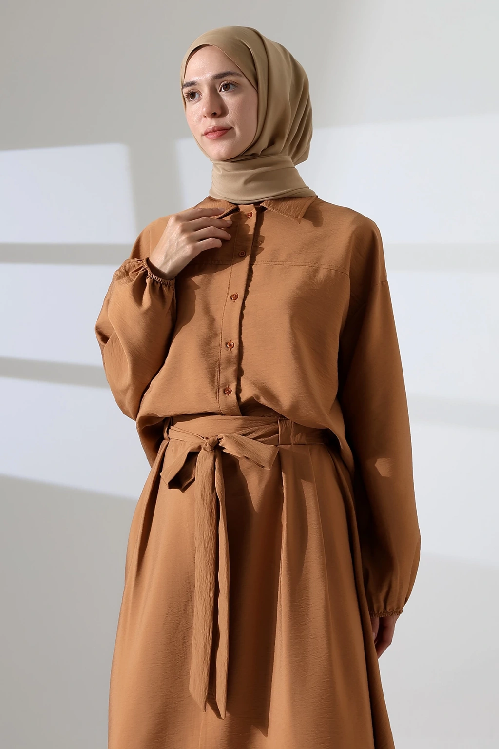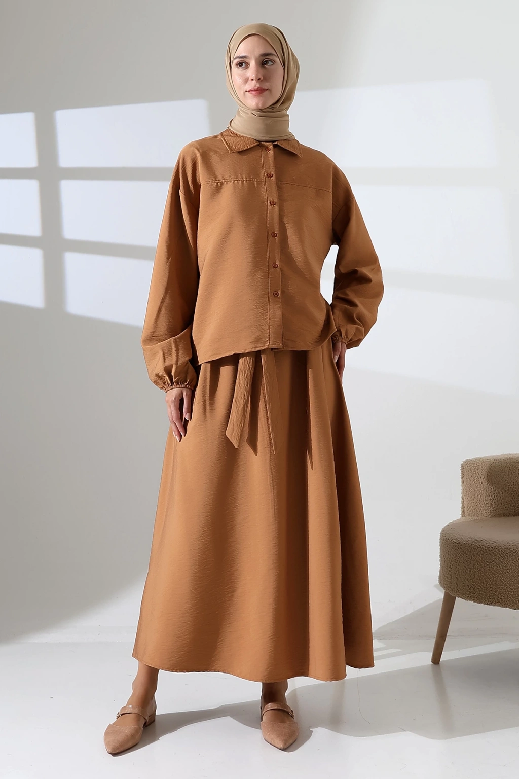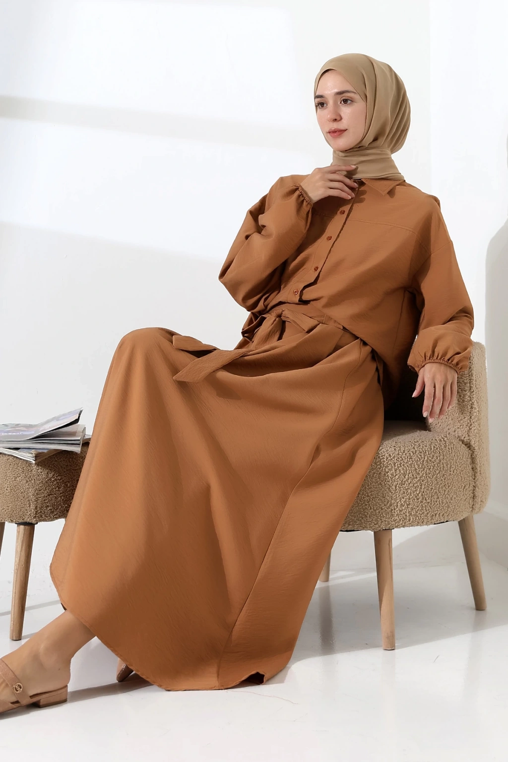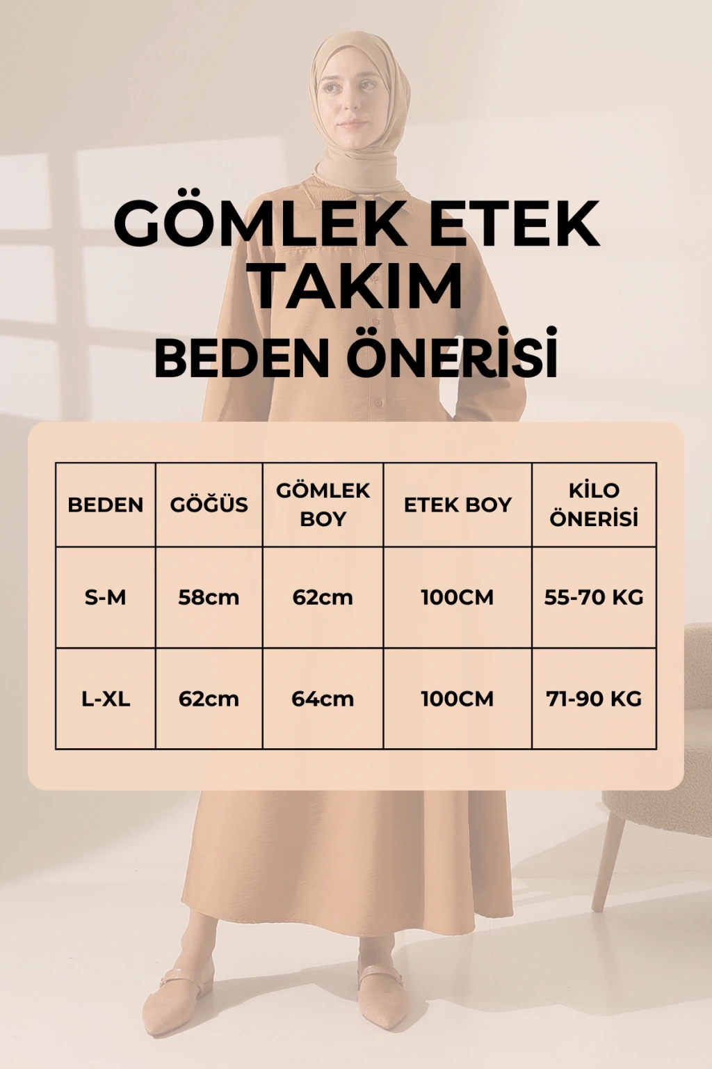 Mihran Butik’in kadın %100 pamuk modal gömlek etek tesettür takımı, doğal dokusu ve modern tasarımıyla günlük şıklığı konforla buluşturur; %100 pamuk modal dokuma kumaştan üretilen takım, nefes alabilen yapısı sayesinde cilt dostudur; Gömlek yakalı, düğmeli ve balon kollu üst parçası feminen detaylarla öne çıkar; Eteğin lastikli beli ve kuşak detayı ise hem kullanım kolaylığı hem de zarif bir siluet sunar; S-M beden seçeneğinde gömlek göğüs ölçüsü 52 cm, uzunluğu 62 cm iken; L-XL bedende göğüs 62 cm, uzunluk ise 64 cm'dir; Her iki beden seçeneğinde de eteğin uzunluğu 100 cm olarak tasarlanmıştır; Ürün, regular kalıbı sayesinde farklı vücut tiplerine uyum sağlar; Beden önerisi olarak S-M beden 55-70 kg arası, L-XL beden ise 71-90 kg arası kullanıcılar için idealdir; Ürün görsellerinde yer alan mankenin boyu 175 cm, göğüs 84 cm, bel 63 cm ve basen ölçüsü 90 cm’dir; Manken S-M beden ürün giymektedir; Bordo, camel, gri, krem, lacivert ve siyah olmak üzere geniş renk seçenekleriyle sunulan bu tesettür takım, gardırobunuzda zamansız bir parça olmaya adaydır; Stüdyo çekimlerinde ışık farkından kaynaklı olarak ürün renklerinde ton farklılıkları görülebilir.
