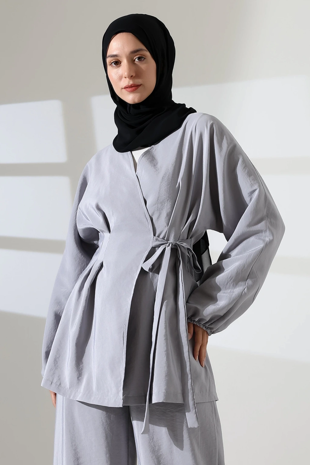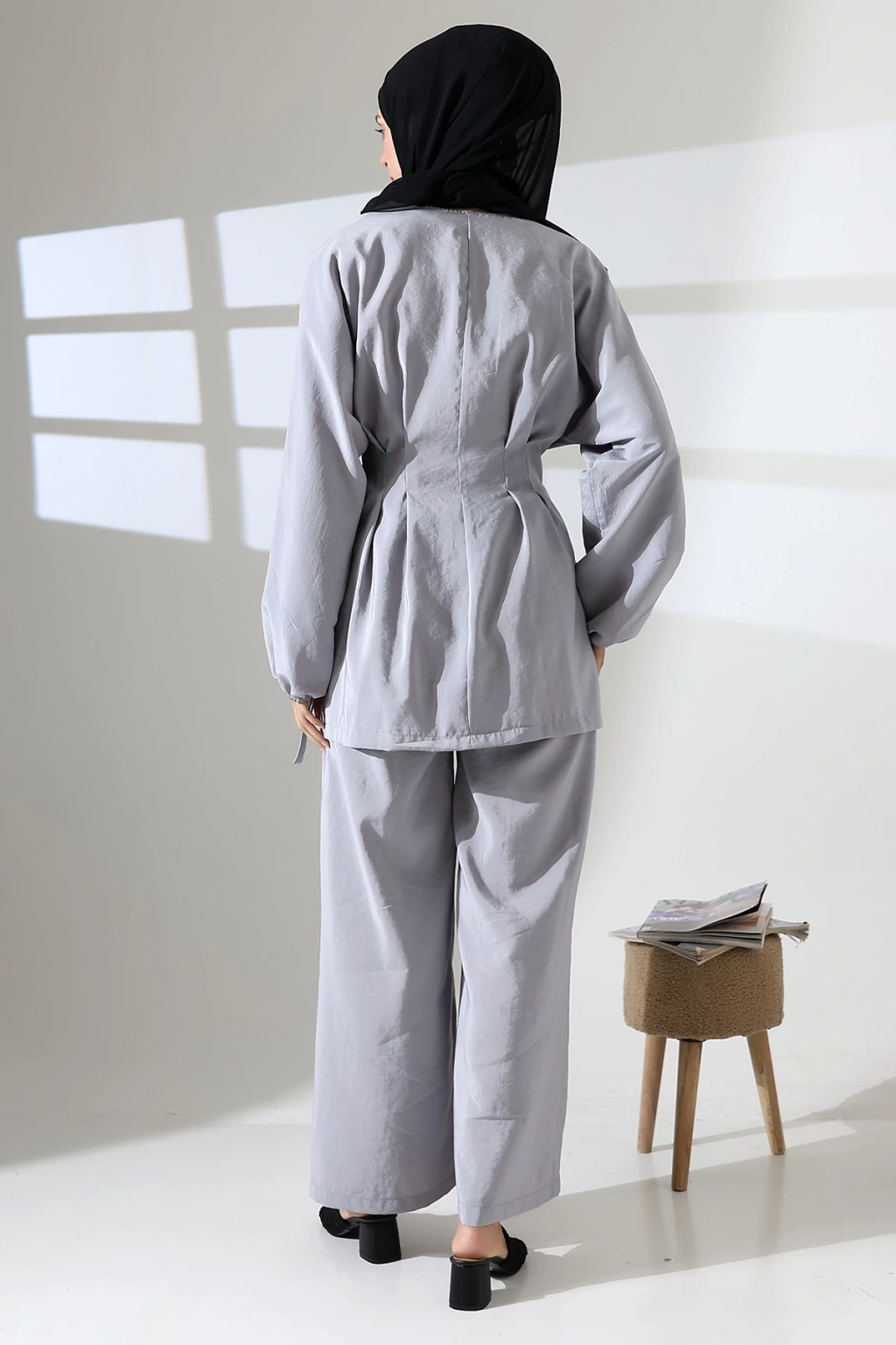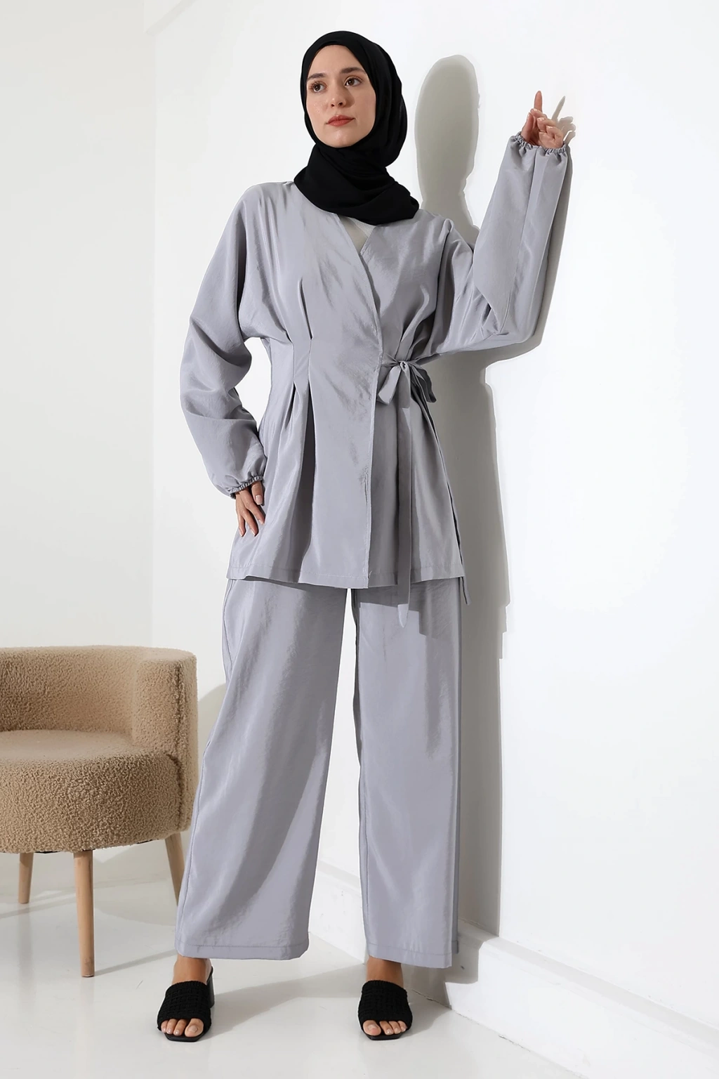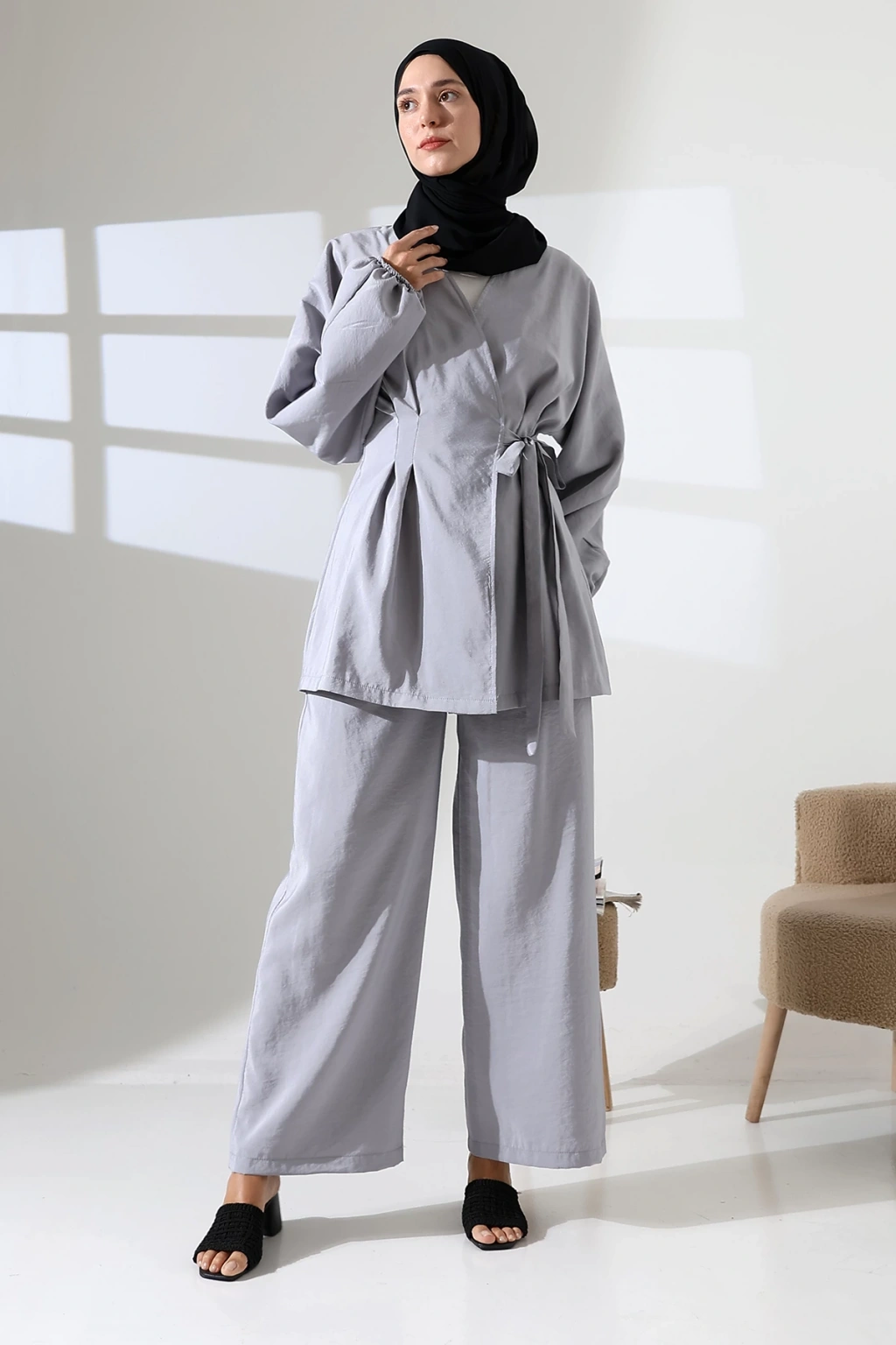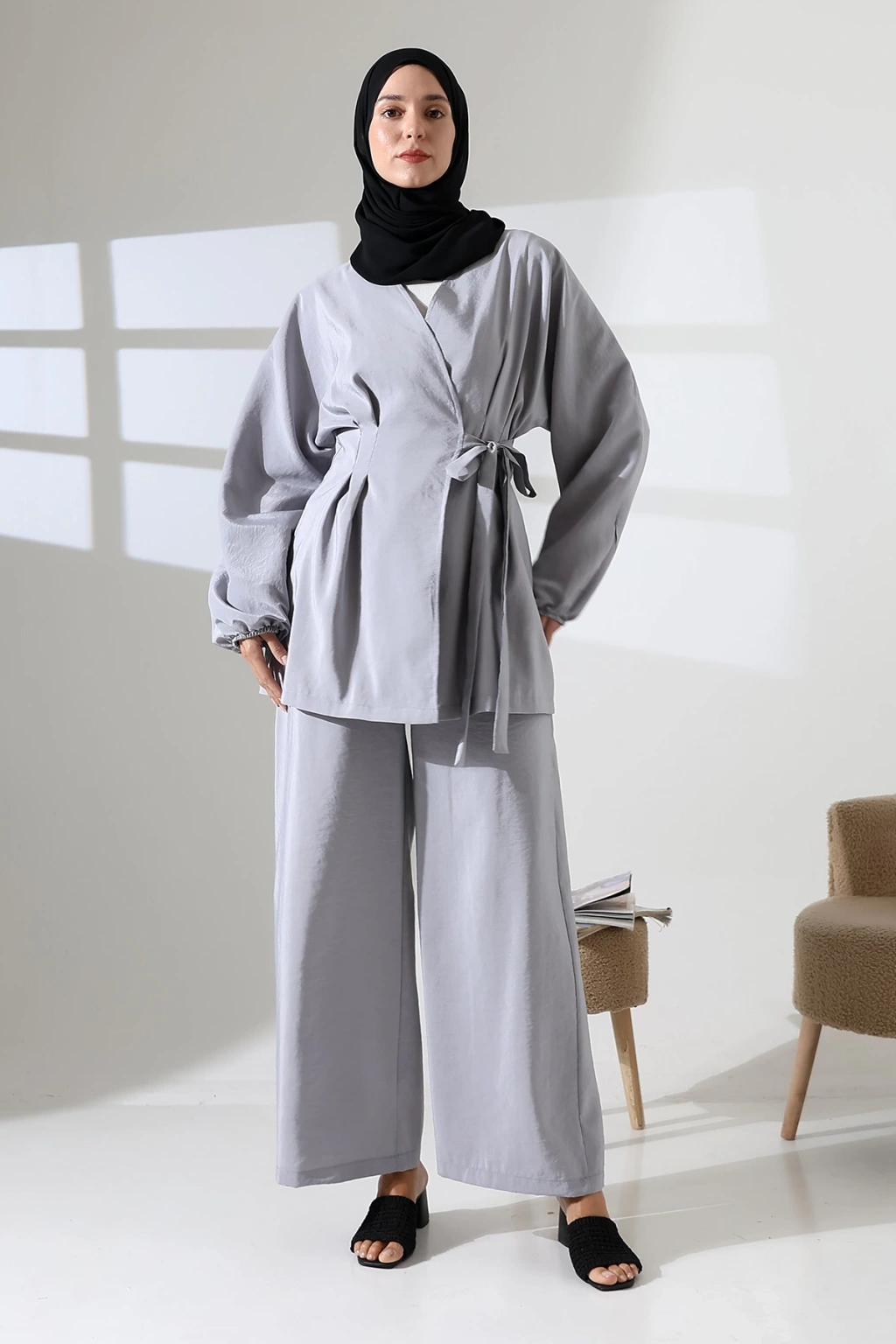 Kadın 100% Pamuk Modal Gri Kimono Pantolon Tesettür Takım