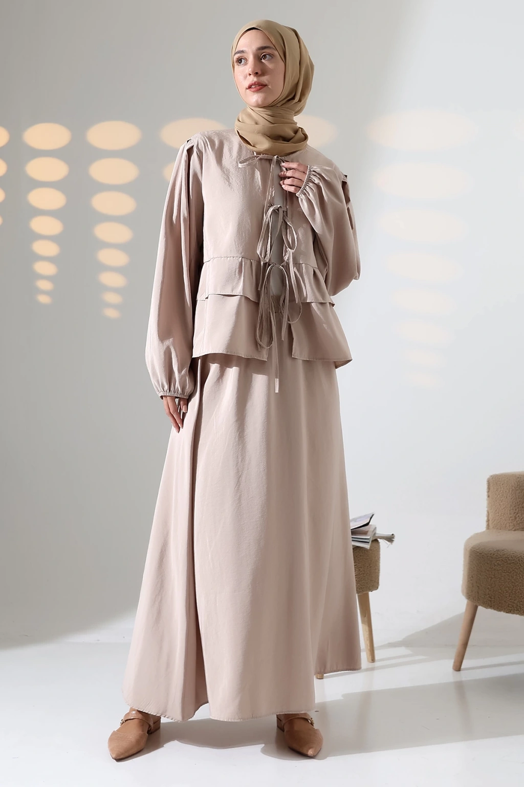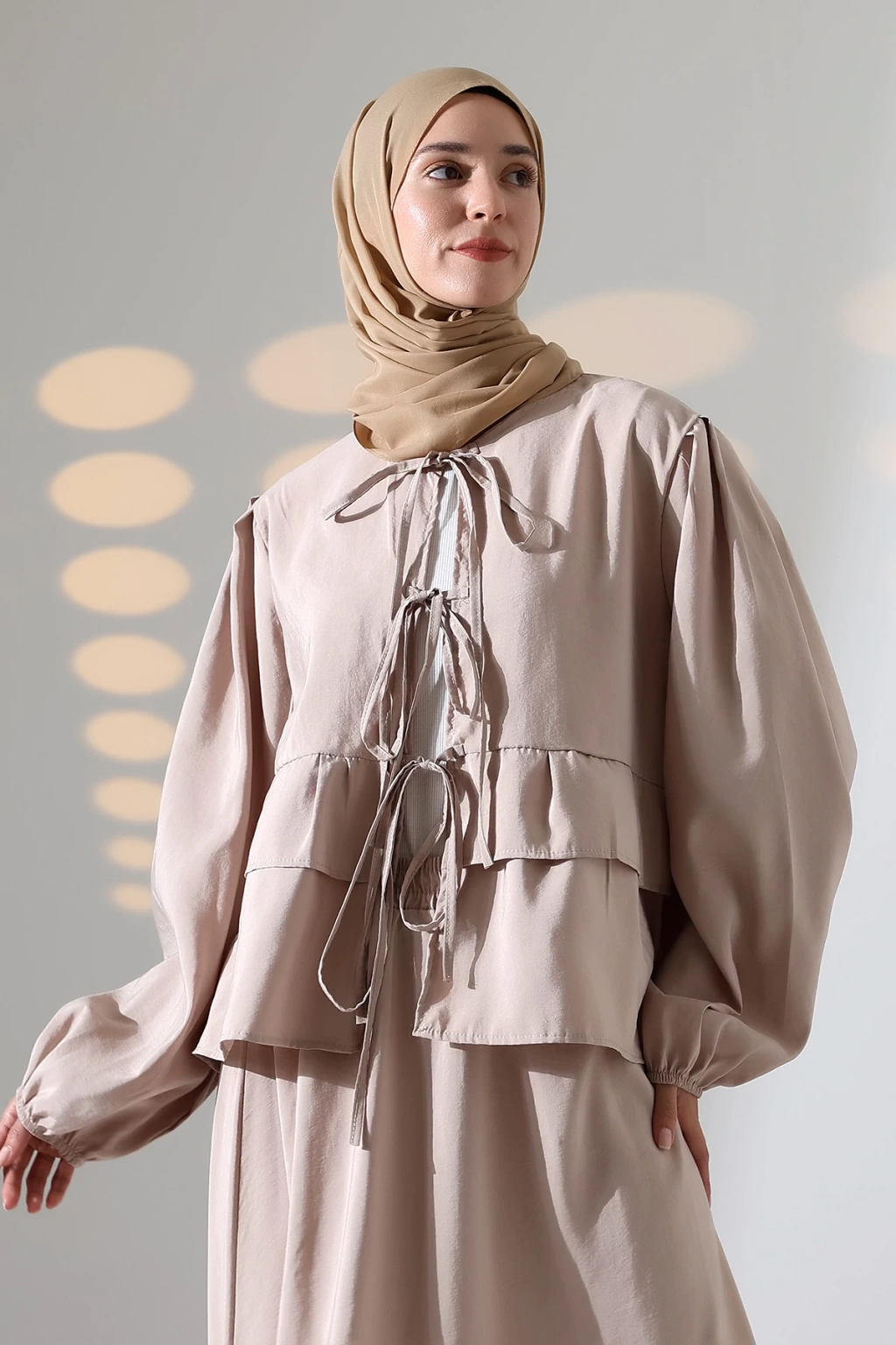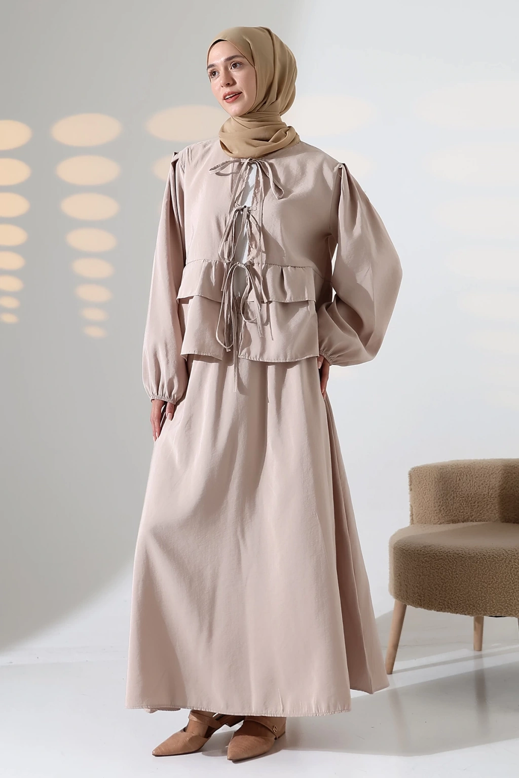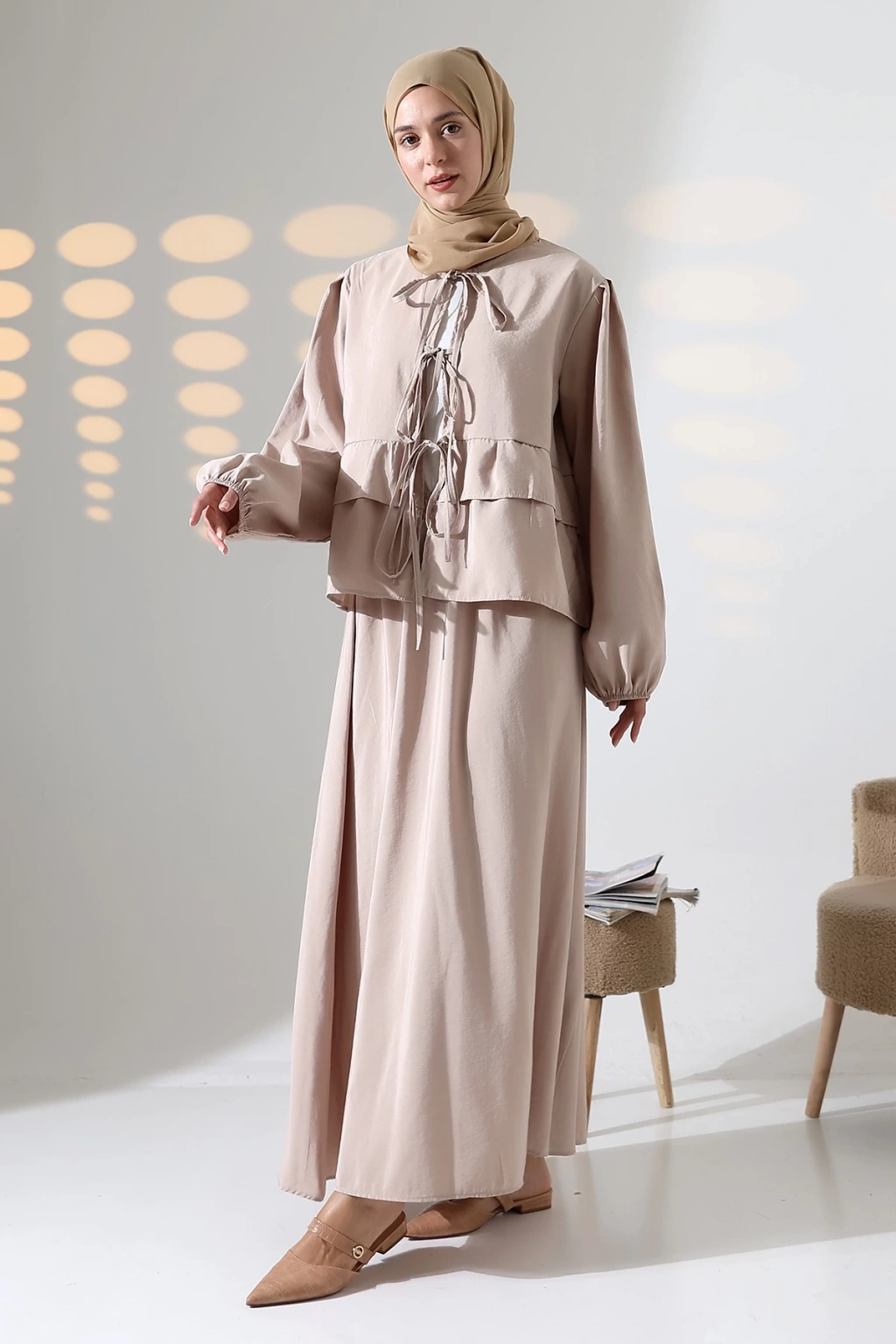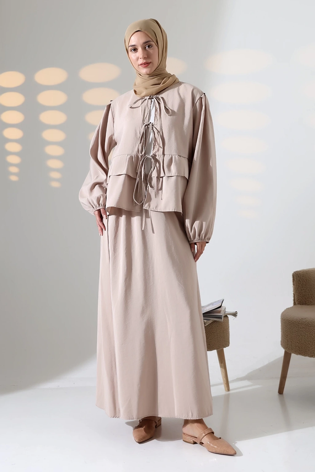 Mihran Butik’in kadın 100% pamuk modal gömlek etek tesettür takımı, zarif tasarımı ve doğal kumaş dokusuyla günlük şıklığınızı tamamlıyor.; 100% pamuk modal dokuma kumaştan üretilen takım, dört mevsim kullanım için uygundur.; Gömlek balon kol tasarımı, fiyonk bağlama detayı ve bileklerdeki lastik yapısıyla şıklığı ve konforu bir arada sunar.; Eteğin beli lastikli olarak tasarlanmış olup, rahat hareket etmenizi sağlar.; S-M ve L-XL beden seçenekleriyle sunulan takımda, S-M beden için gömlek göğüs ölçüsü 55 cm ve uzunluğu 62 cm; L-XL beden için göğüs ölçüsü 59 cm ve uzunluğu 63 cm’dir.; Her iki beden için eteğin uzunluğu 100 cm’dir.; Beden önerisi olarak, S-M beden 55-70 kg; L-XL beden 71-90 kg arasındaki kullanıcılar için uygundur.; Regular kalıp yapısıyla vücuda rahat bir oturuş sunan bu takım, beyaz, bordo, gri, haki, kahverengi ve krem renk seçenekleriyle satışa sunulmaktadır.; Fotoğraftaki mankenin boyu 175 cm, göğüs 84 cm, bel 63 cm, basen ölçüsü 90 cm olup, üzerindeki ürün S-M bedendir.; Stüdyo çekimlerinde ışık farkından dolayı renklerde ton farklılıkları oluşabilir.