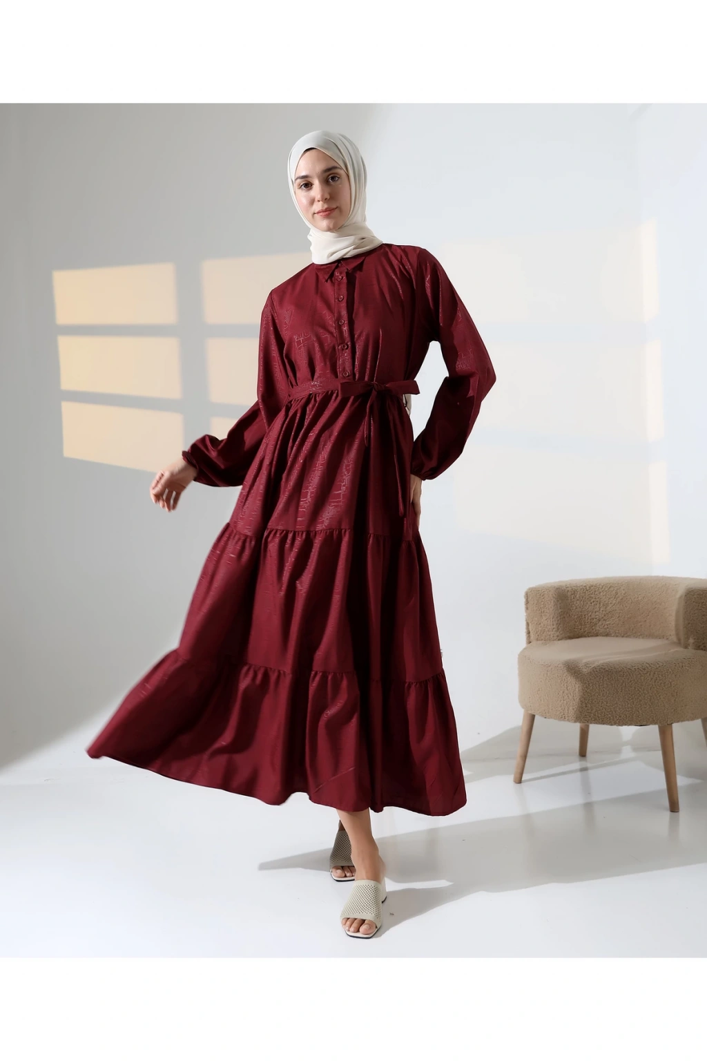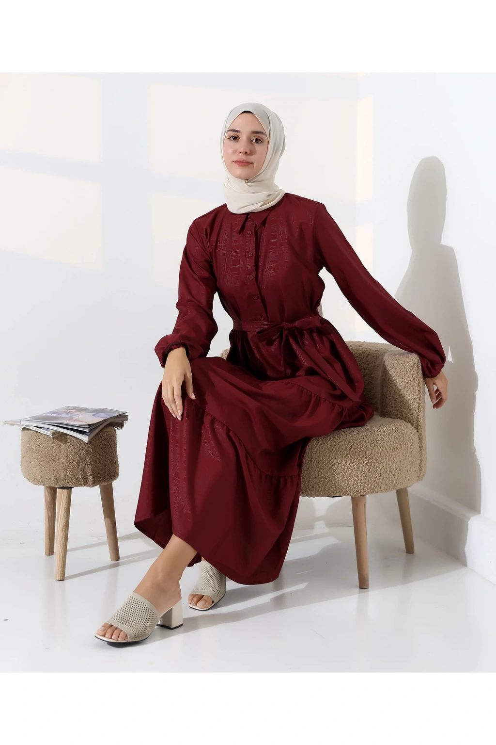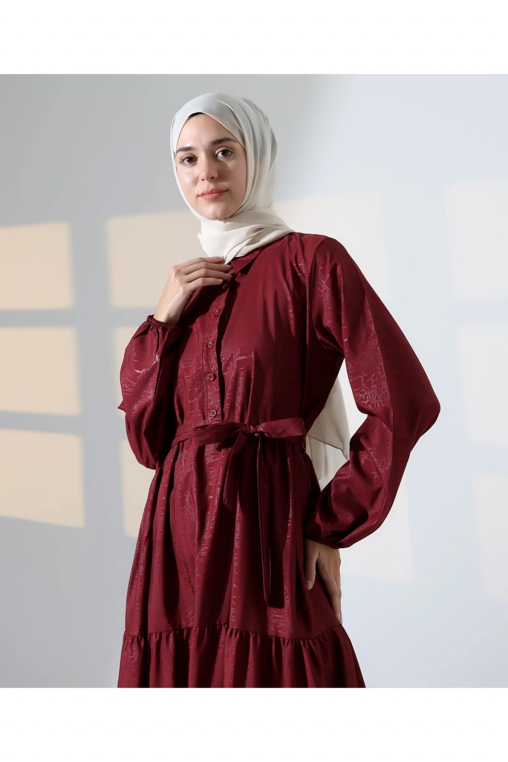 Kadın 100% Pamuk Viskon Desenli Bordo Tesettür Elbise