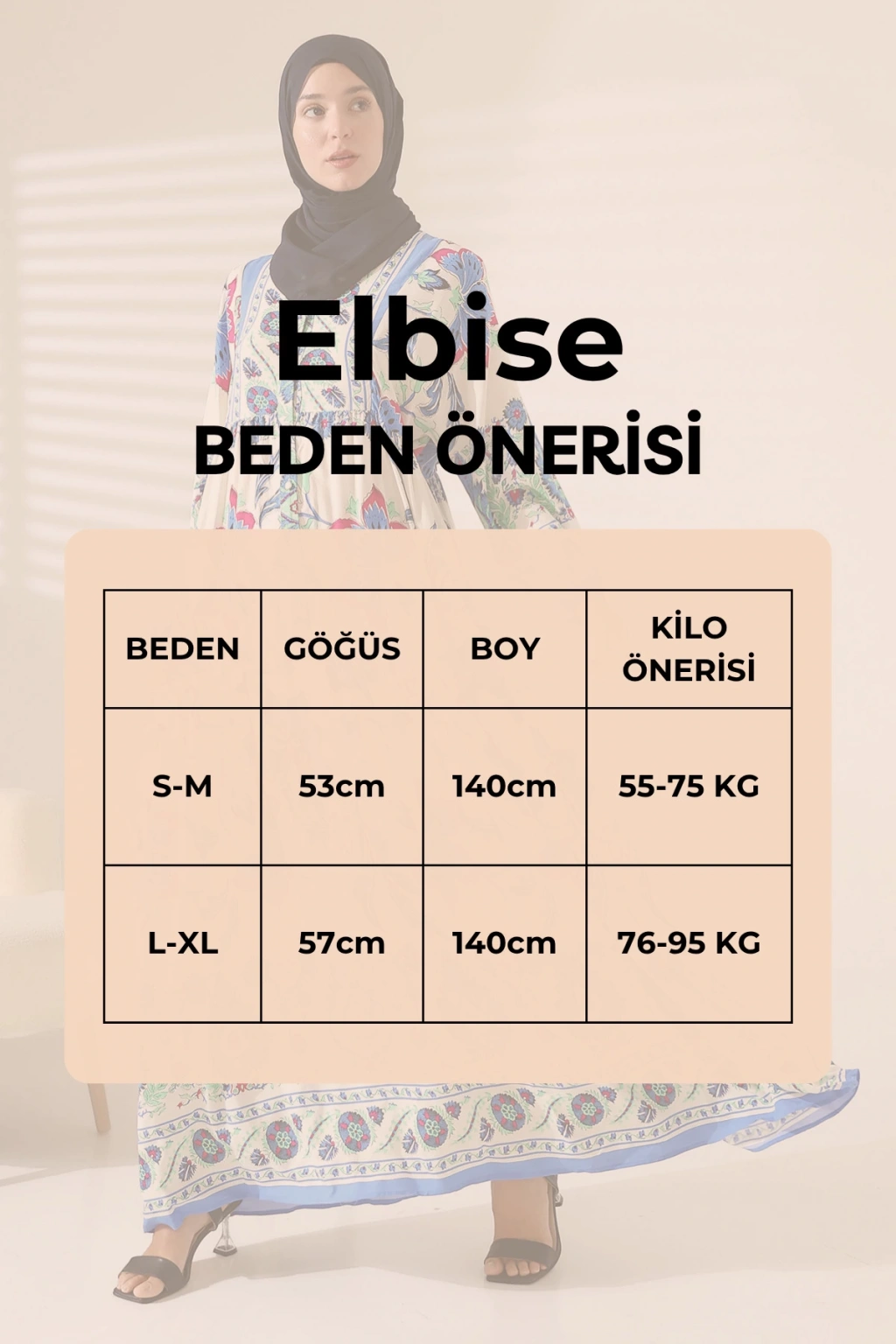 Mihran Butik’in kadın %100 pamuk viskon desenli tesettür elbisesi, doğal dokusu ve zarif görünümüyle günlük kombinlerden özel gün şıklığına kadar geniş bir kullanım alanı sunar.; Nefes alabilir pamuk viskon kumaşı sayesinde dört mevsim rahatlıkla tercih edilebilir.; Hakim yaka detayı, bilekleri lastikli yapısı ve önden düğme kapamalı tasarımıyla şıklığı fonksiyonellikle buluşturur.; Çiçek desenli yapısı elbiseye zarif bir görünüm katarken, S-M ve L-XL olmak üzere iki farklı beden seçeneği sunar.; S-M beden için göğüs ölçüsü 50 cm, uzunluk 140 cm; L-XL beden için ise göğüs ölçüsü 54 cm, uzunluk 140 cm’dir.; Beden önerisi olarak S-M beden 55-70 kg arası; L-XL beden ise 71-90 kg arası kullanıcılar için idealdir.; Regular kalıbıyla rahat ve modern bir duruş sunan elbise, mavi ve turuncu renk alternatifleriyle satışa sunulmaktadır.; Fotoğraftaki mankenin boyu 175 cm, göğüs 84 cm, bel 63 cm ve basen 90 cm olup, üzerindeki beden S-M'dir.; Stüdyo çekimlerinde renkler ışık farklılığından dolayı değişiklik gösterebilir.