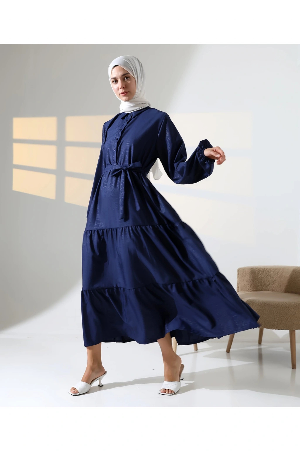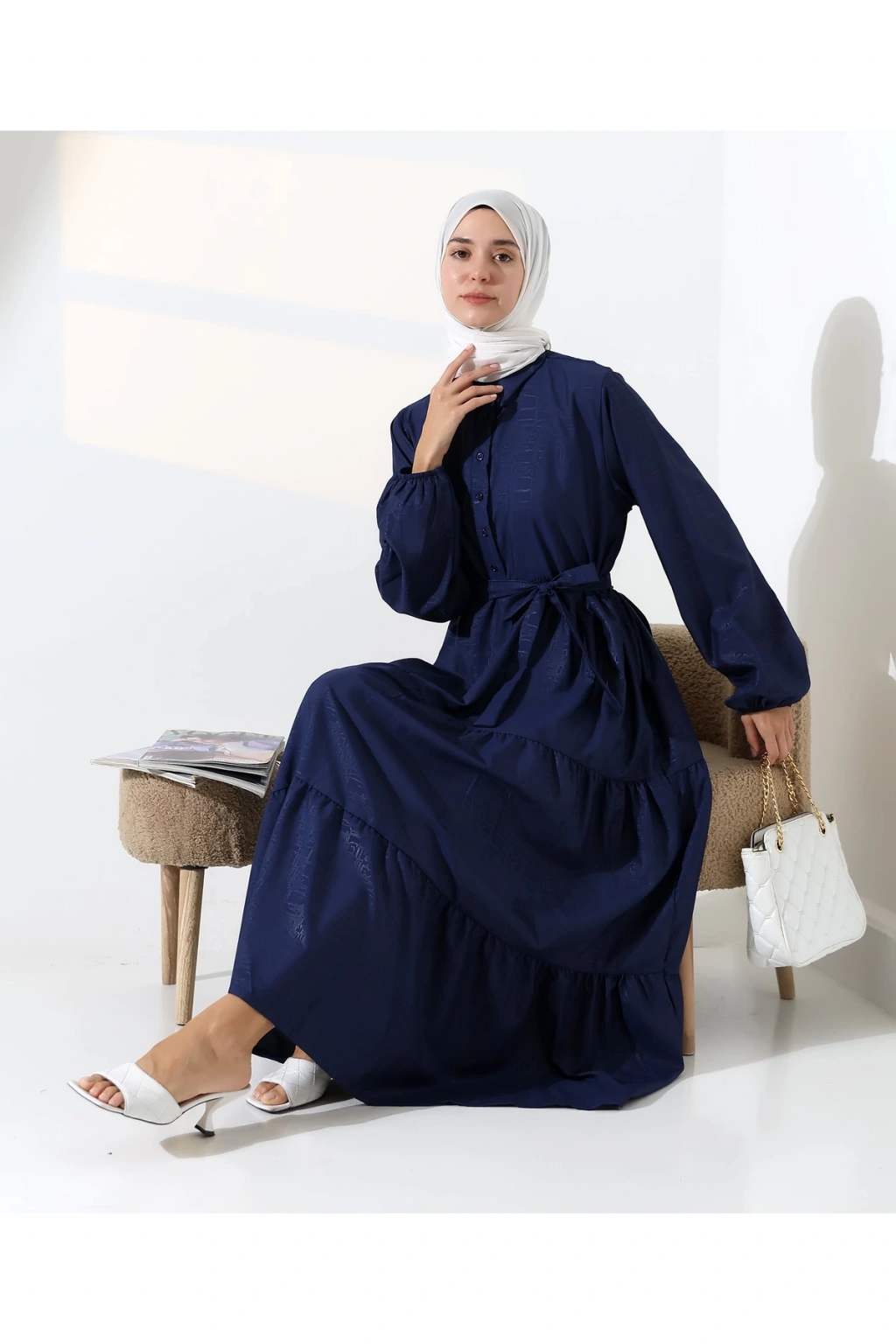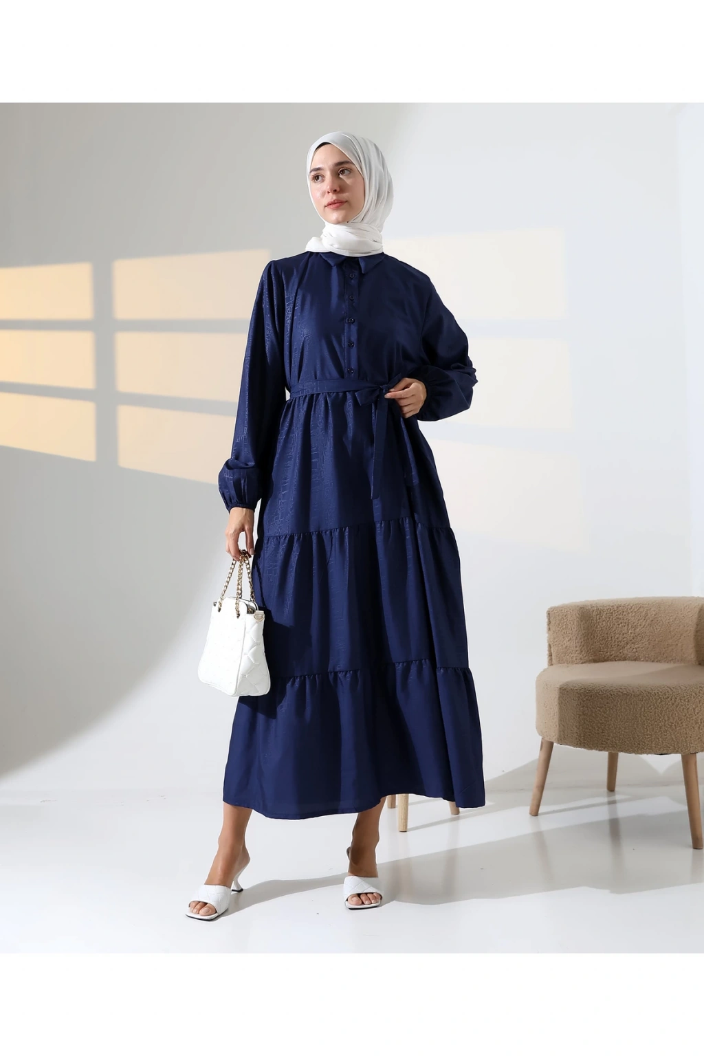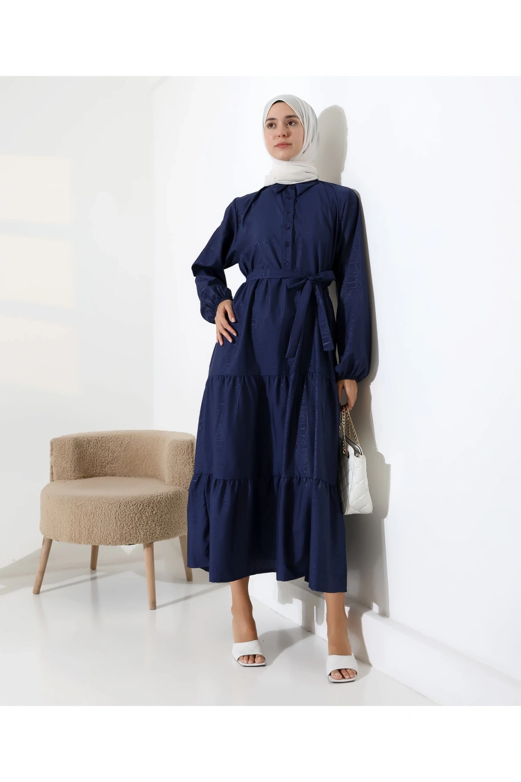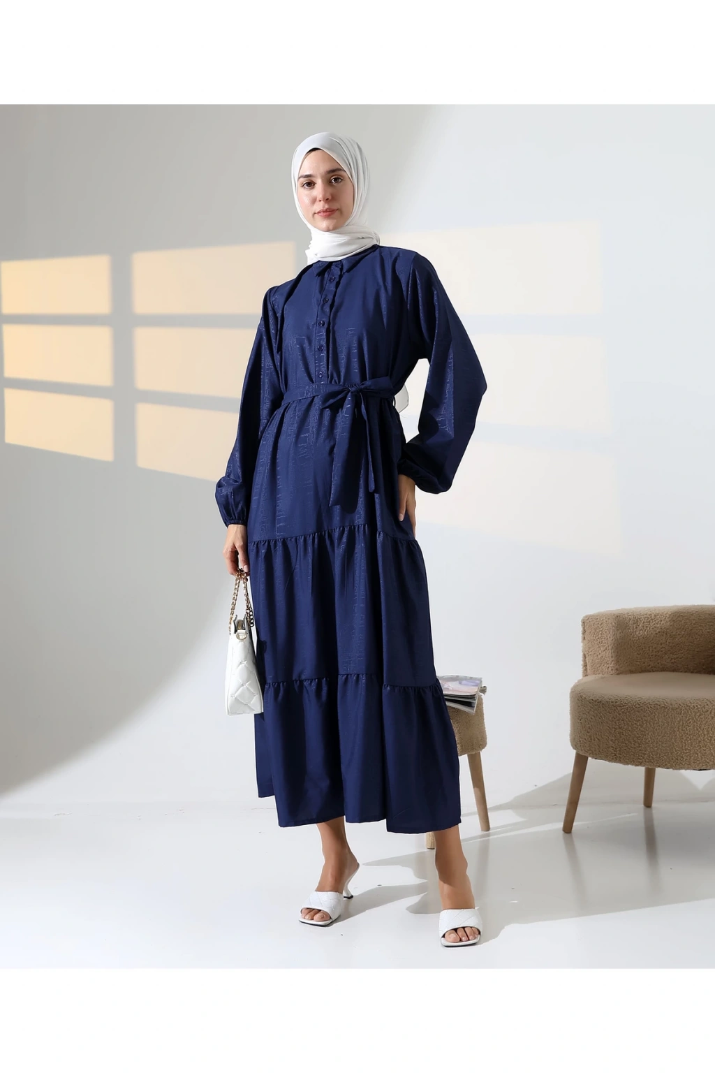 Mihran Butik’in kadın %100 pamuk viskon desenli tesettür elbisesi, doğal dokusu ve zarif görünümüyle günlük kombinlerden özel gün şıklığına kadar geniş bir kullanım alanı sunar.; Nefes alabilir pamuk viskon kumaşı sayesinde dört mevsim rahatlıkla tercih edilebilir.; Hakim yaka detayı, bilekleri lastikli yapısı ve önden düğme kapamalı tasarımıyla şıklığı fonksiyonellikle buluşturur.; Çiçek desenli yapısı elbiseye zarif bir görünüm katarken, S-M ve L-XL olmak üzere iki farklı beden seçeneği sunar.; S-M beden için göğüs ölçüsü 50 cm, uzunluk 140 cm; L-XL beden için ise göğüs ölçüsü 54 cm, uzunluk 140 cm’dir.; Beden önerisi olarak S-M beden 55-70 kg arası; L-XL beden ise 71-90 kg arası kullanıcılar için idealdir.; Regular kalıbıyla rahat ve modern bir duruş sunan elbise, mavi ve turuncu renk alternatifleriyle satışa sunulmaktadır.; Fotoğraftaki mankenin boyu 175 cm, göğüs 84 cm, bel 63 cm ve basen 90 cm olup, üzerindeki beden S-M'dir.; Stüdyo çekimlerinde renkler ışık farklılığından dolayı değişiklik gösterebilir.