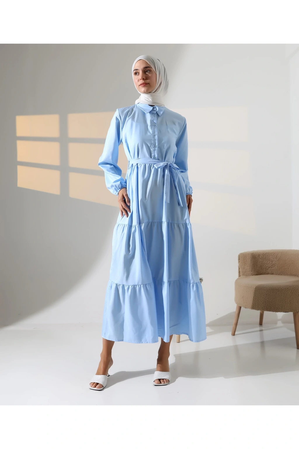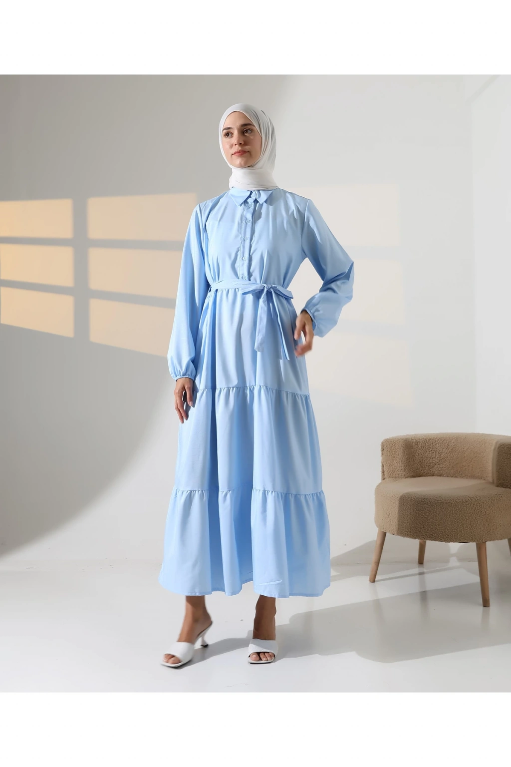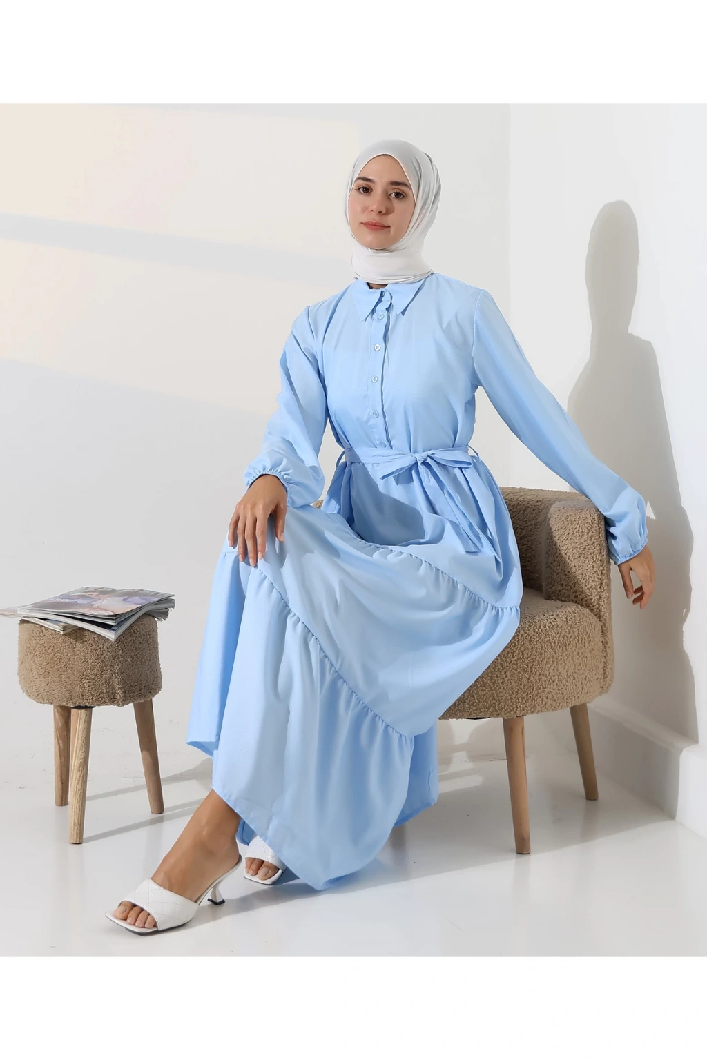 Mihran Butik’in kadın %100 pamuk viskon desenli tesettür elbisesi, doğal dokusu ve zarif görünümüyle günlük kombinlerden özel gün şıklığına kadar geniş bir kullanım alanı sunar.; Nefes alabilir pamuk viskon kumaşı sayesinde dört mevsim rahatlıkla tercih edilebilir.; Hakim yaka detayı, bilekleri lastikli yapısı ve önden düğme kapamalı tasarımıyla şıklığı fonksiyonellikle buluşturur.; Çiçek desenli yapısı elbiseye zarif bir görünüm katarken, S-M ve L-XL olmak üzere iki farklı beden seçeneği sunar.; S-M beden için göğüs ölçüsü 50 cm, uzunluk 140 cm; L-XL beden için ise göğüs ölçüsü 54 cm, uzunluk 140 cm’dir.; Beden önerisi olarak S-M beden 55-70 kg arası; L-XL beden ise 71-90 kg arası kullanıcılar için idealdir.; Regular kalıbıyla rahat ve modern bir duruş sunan elbise, mavi ve turuncu renk alternatifleriyle satışa sunulmaktadır.; Fotoğraftaki mankenin boyu 175 cm, göğüs 84 cm, bel 63 cm ve basen 90 cm olup, üzerindeki beden S-M'dir.; Stüdyo çekimlerinde renkler ışık farklılığından dolayı değişiklik gösterebilir.