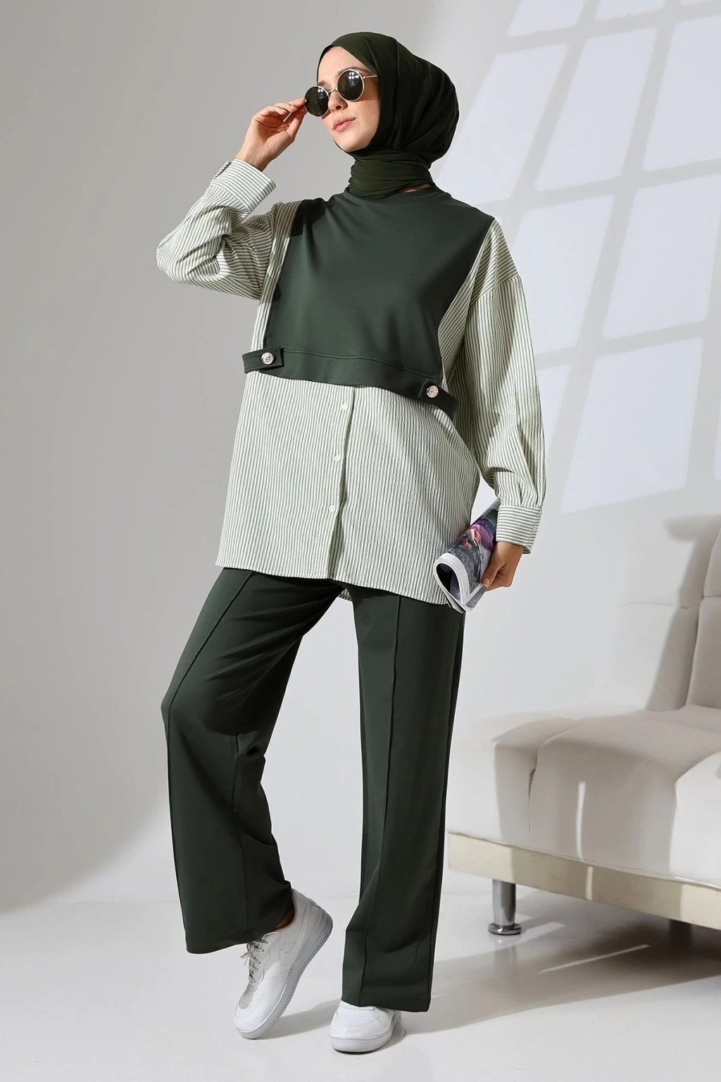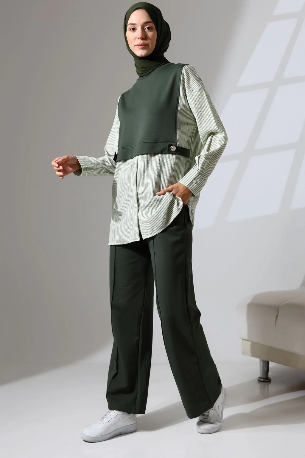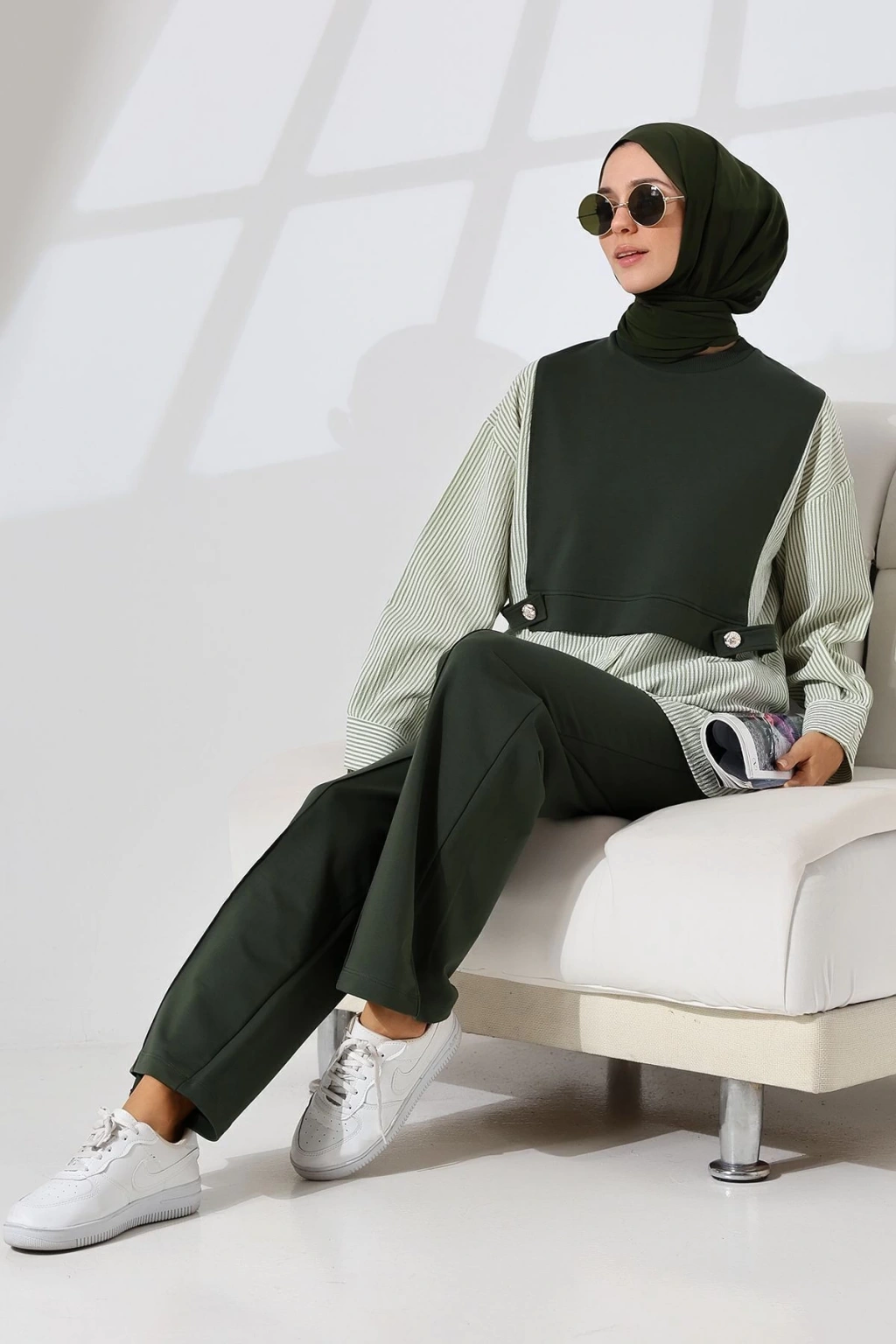 Kadın Haki Yeşili Mevsimlik Penye Alt Üst Spor Ve Rahat Ikili Tunik Pantolon Şık Tesettür Takım