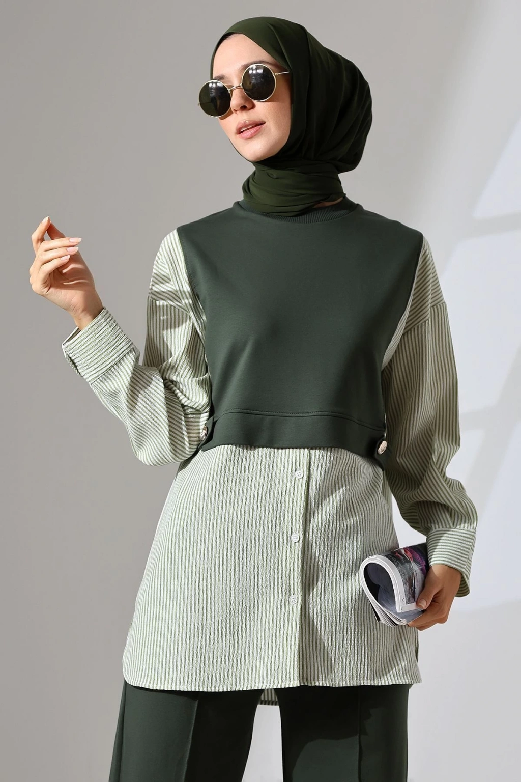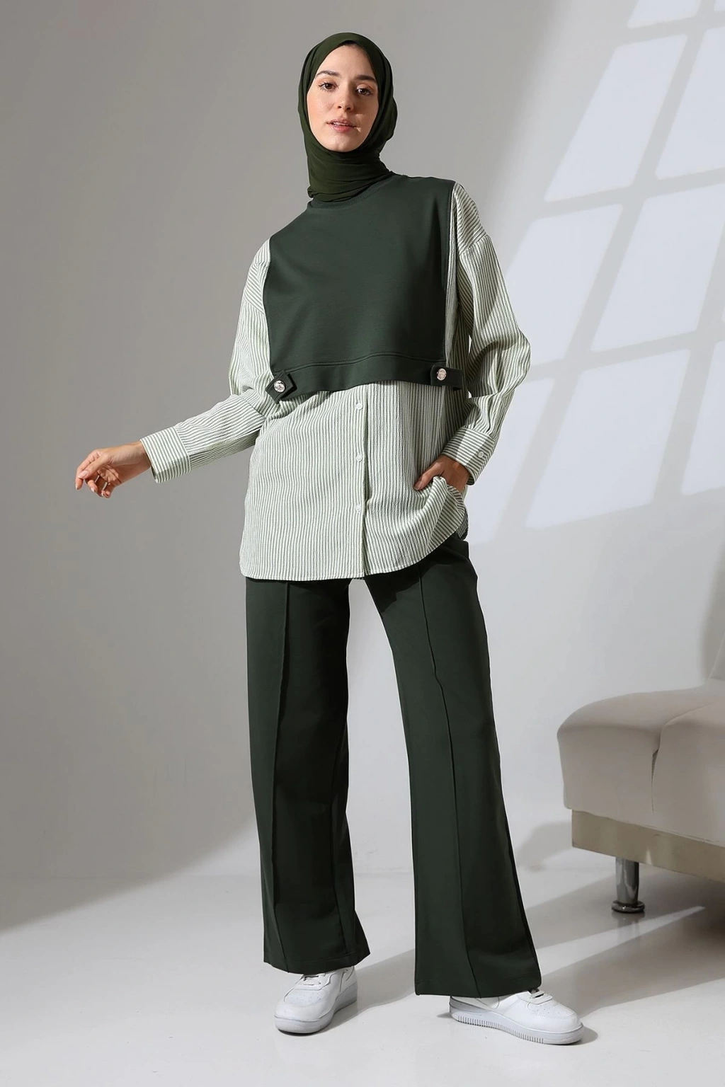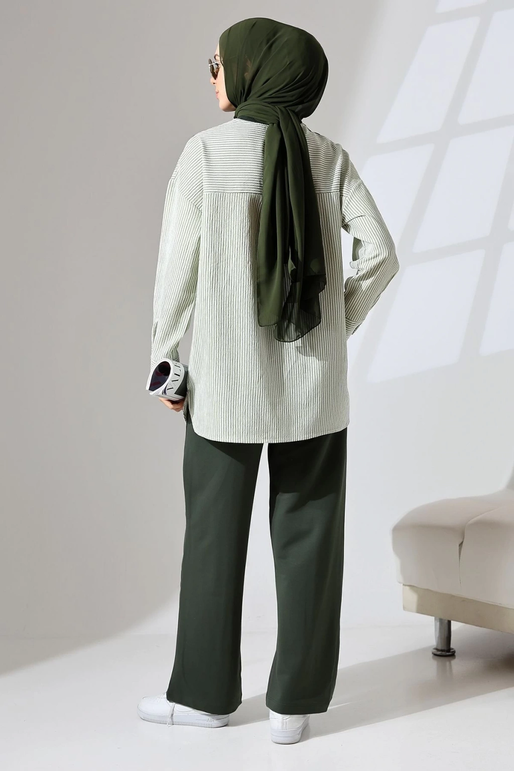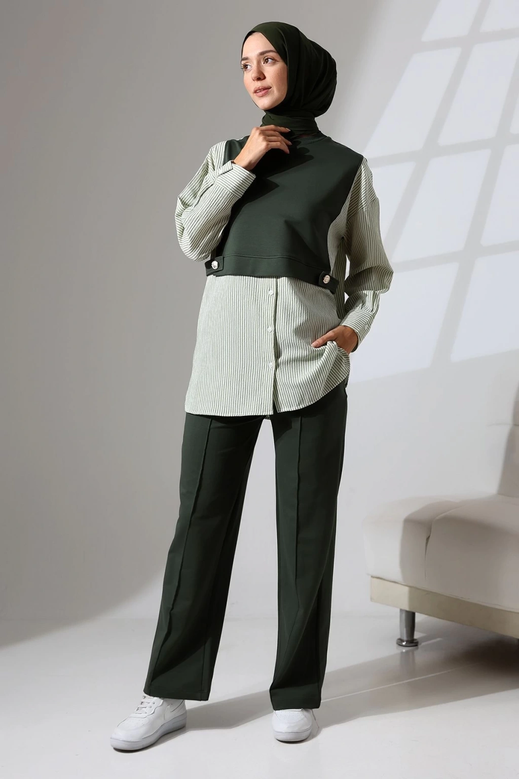 Kadın Haki Yeşili Mevsimlik Penye Alt Üst Spor Ve Rahat Ikili Tunik Pantolon Şık Tesettür Takım