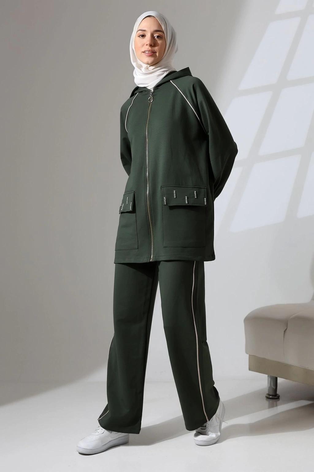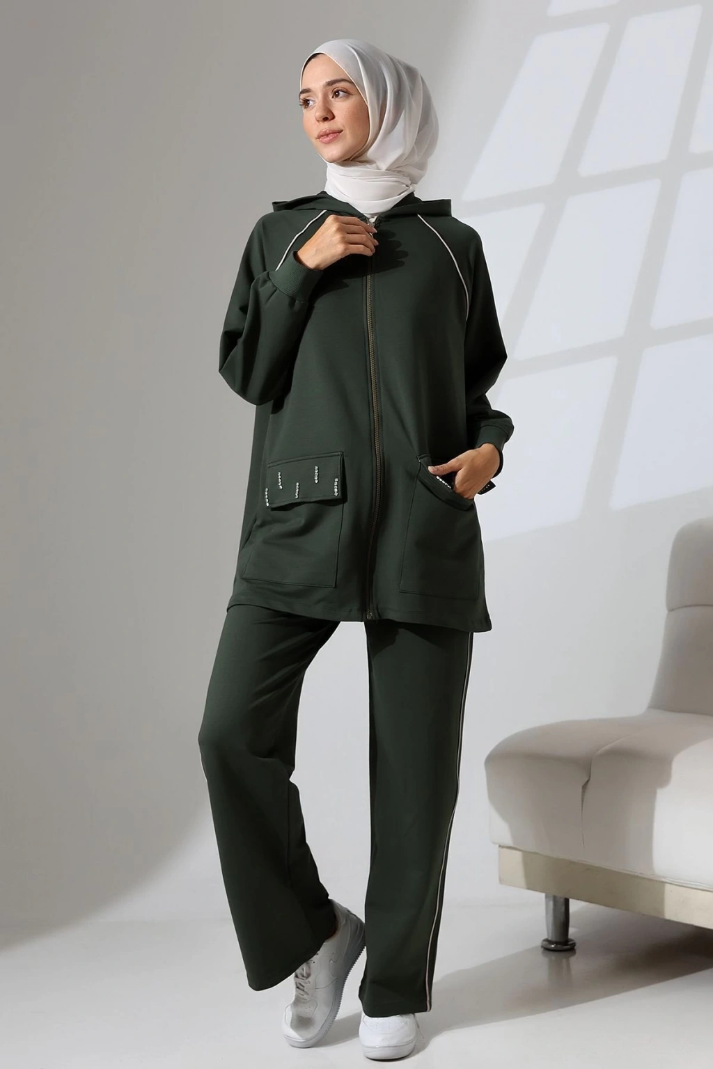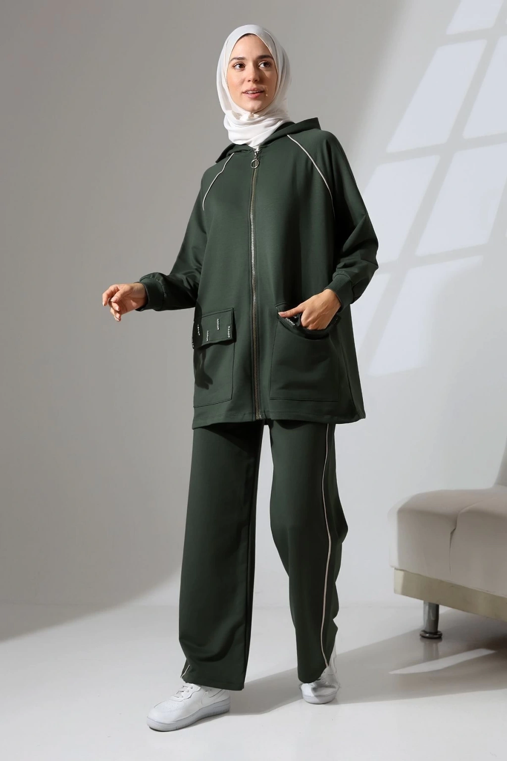 Kadın Haki Yeşili Mevsimlik Penye Alt Üst Spor Ve Rahat Ikili Tunik Pantolon Şık Tesettür Takım