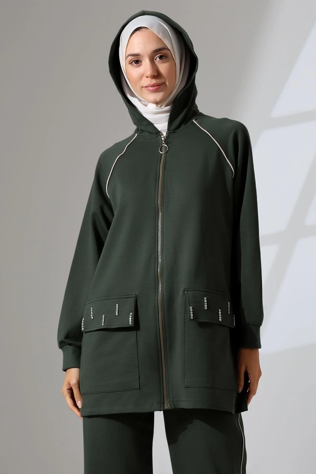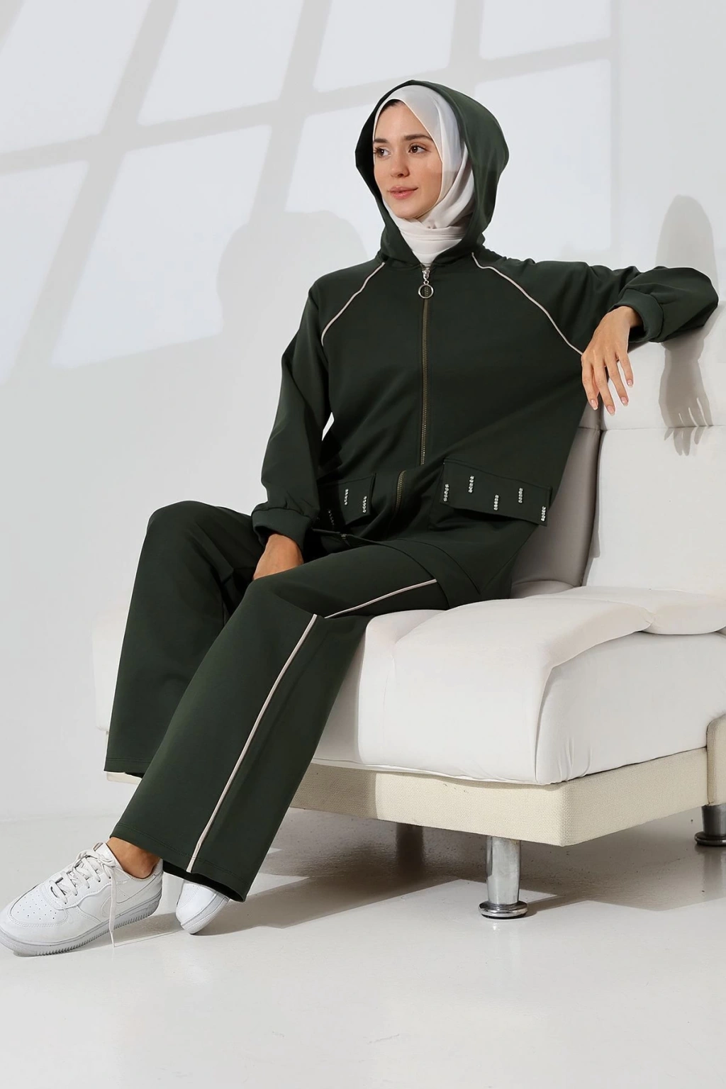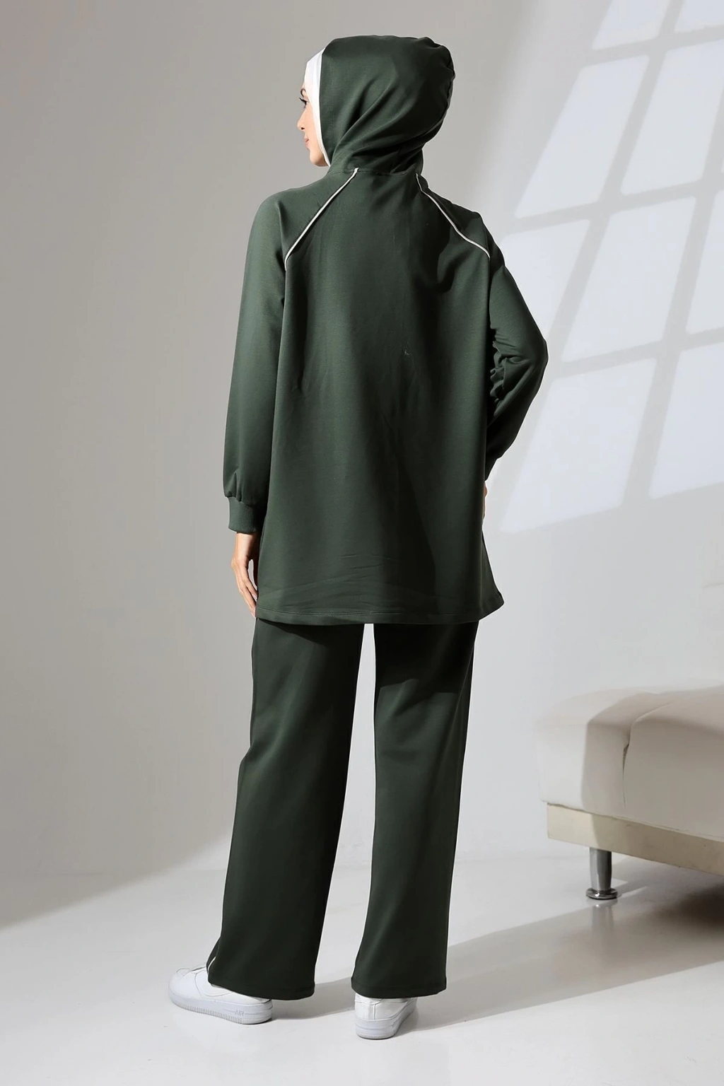 Kadın Haki Yeşili Mevsimlik Penye Alt Üst Spor Ve Rahat Ikili Tunik Pantolon Şık Tesettür Takım