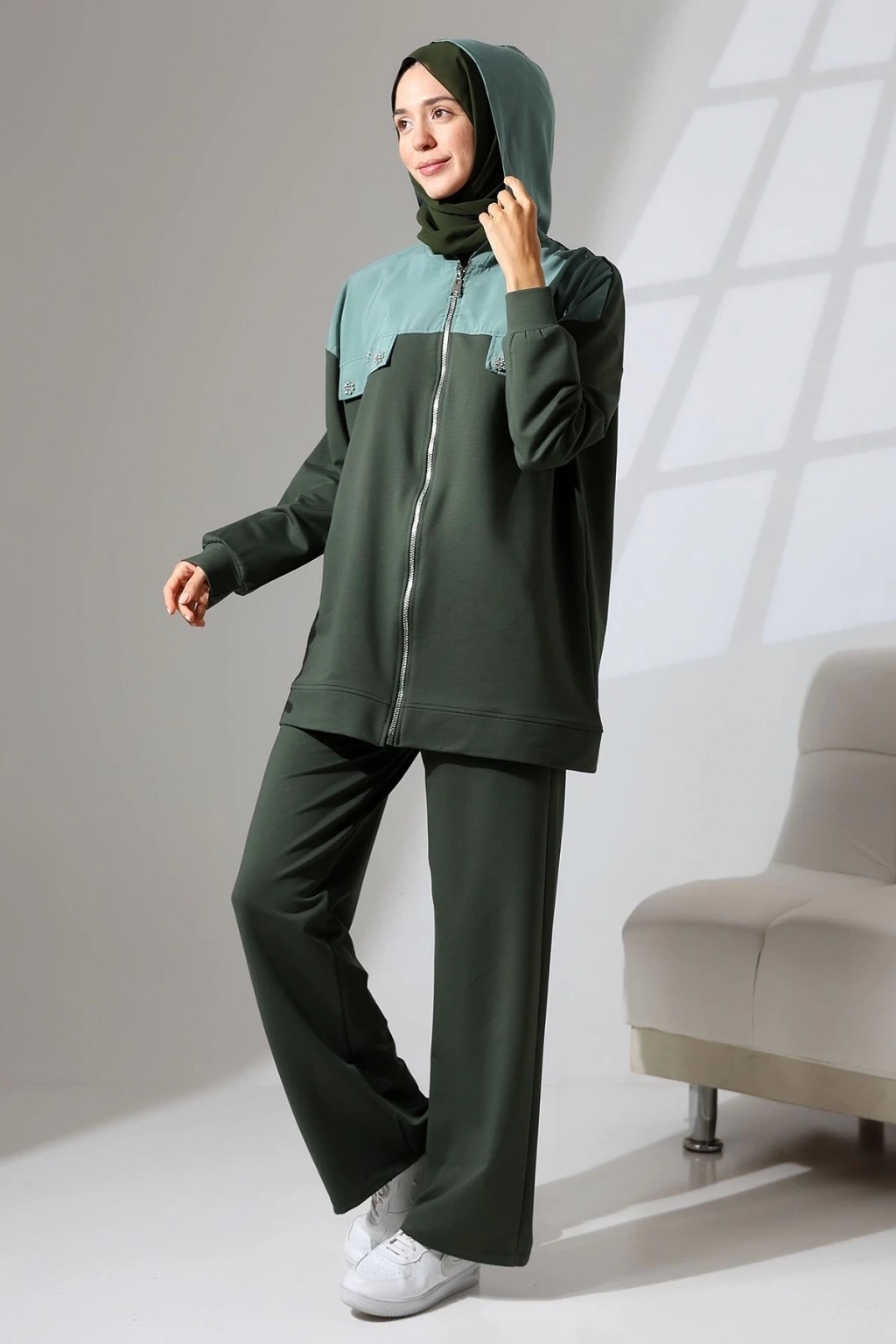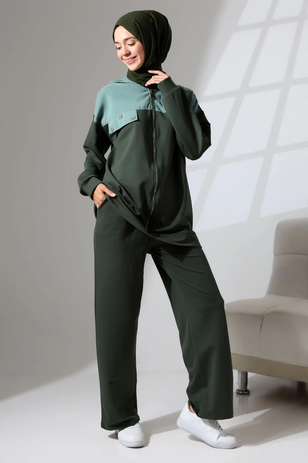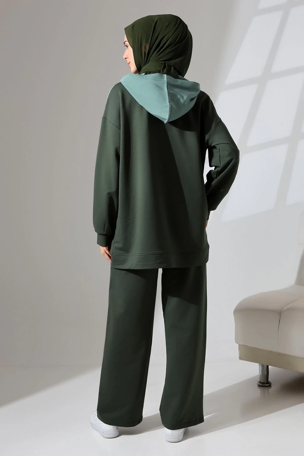 Kadın Haki Yeşili Mevsimlik Penye Alt Üst Spor Ve Rahat Ikili Tunik Pantolon Şık Tesettür Takım