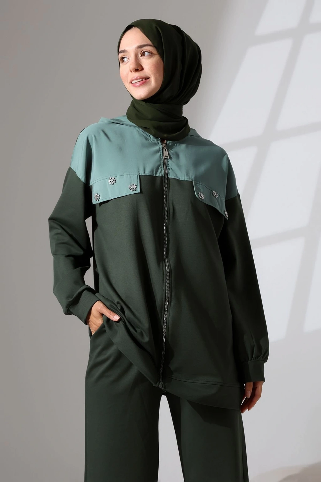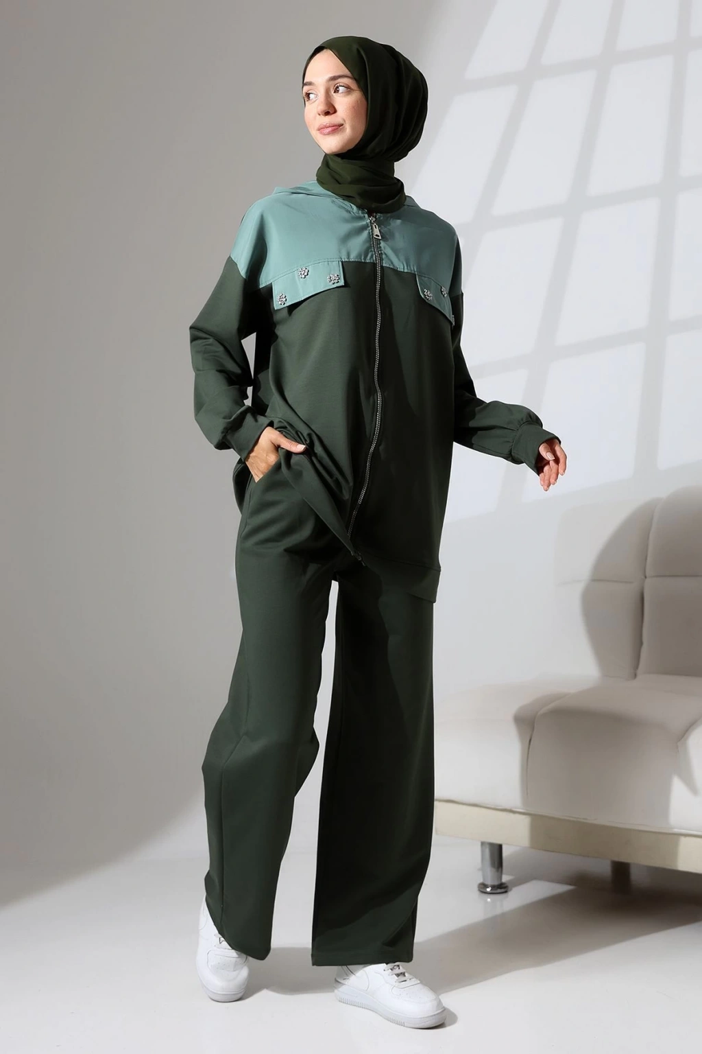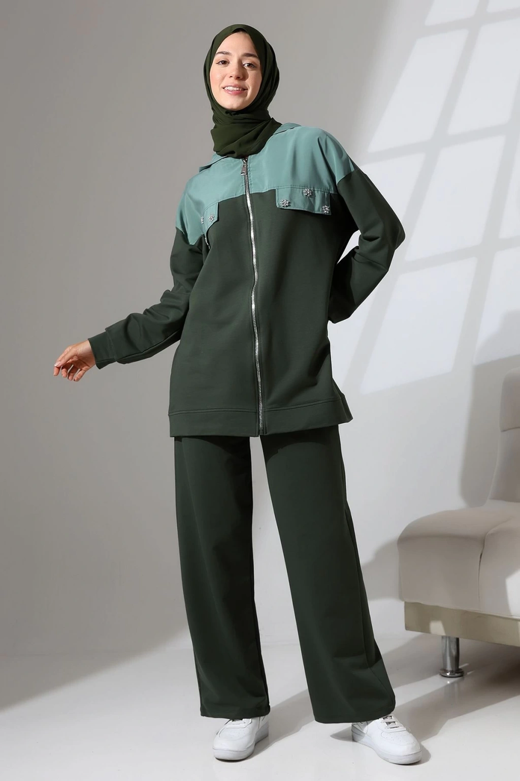 Kadın Haki Yeşili Mevsimlik Penye Alt Üst Spor Ve Rahat Ikili Tunik Pantolon Şık Tesettür Takım