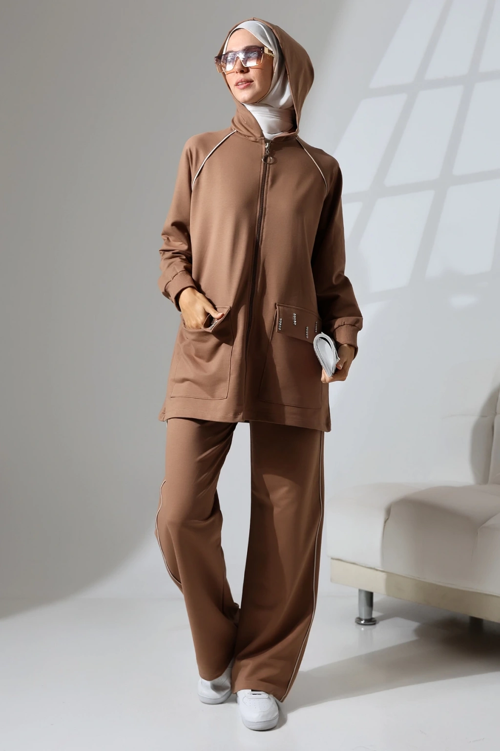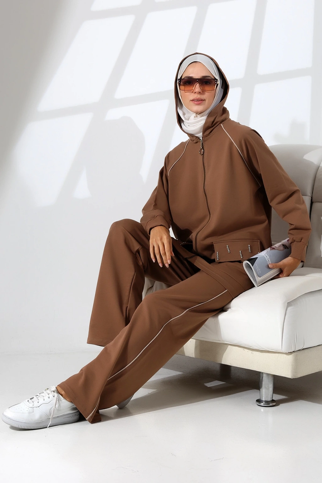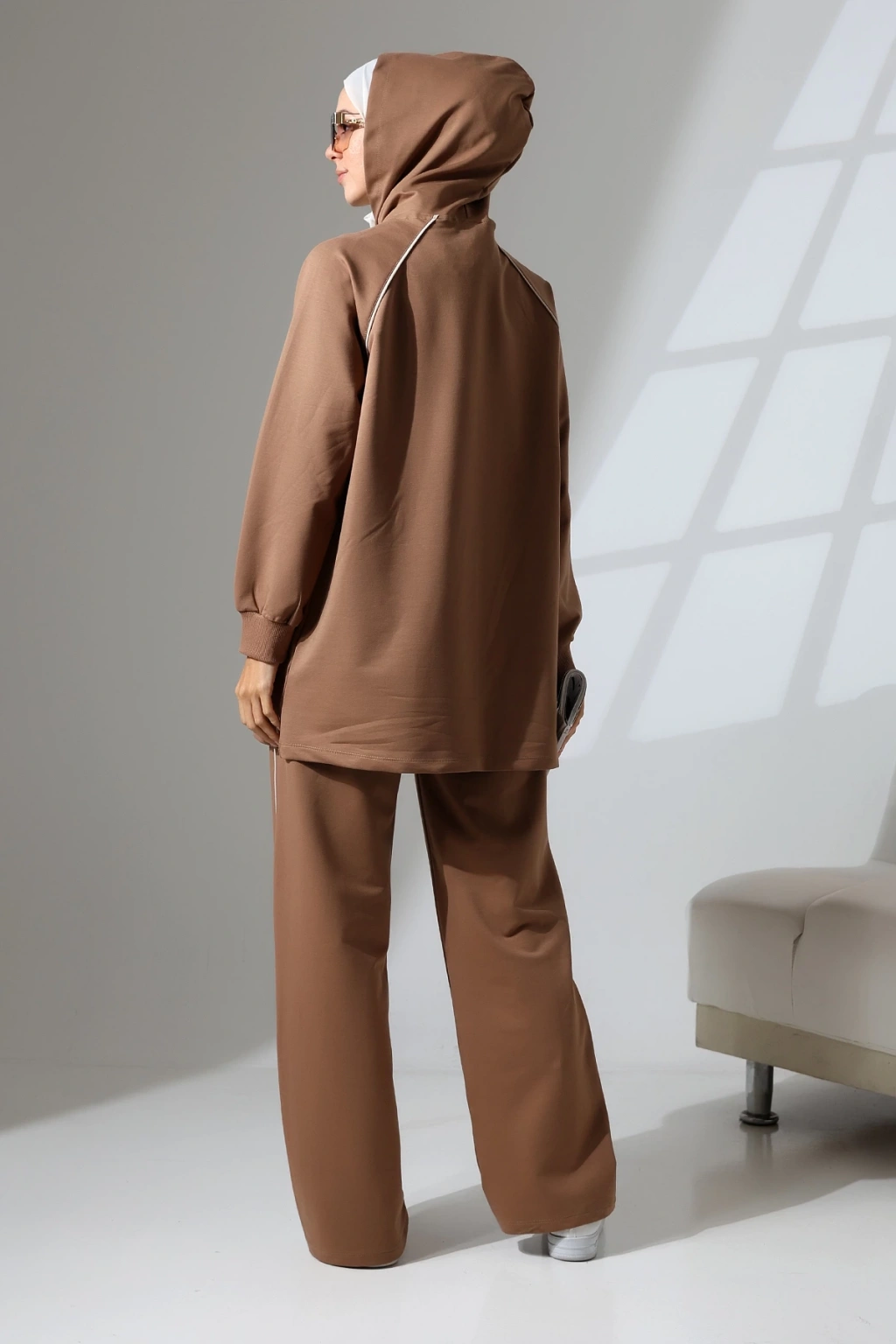 Kadın Kahverengi Mevsimlik Penye Alt Üst Spor Ve Rahat Ikili Tunik Pantolon Şık Tesettür Takım