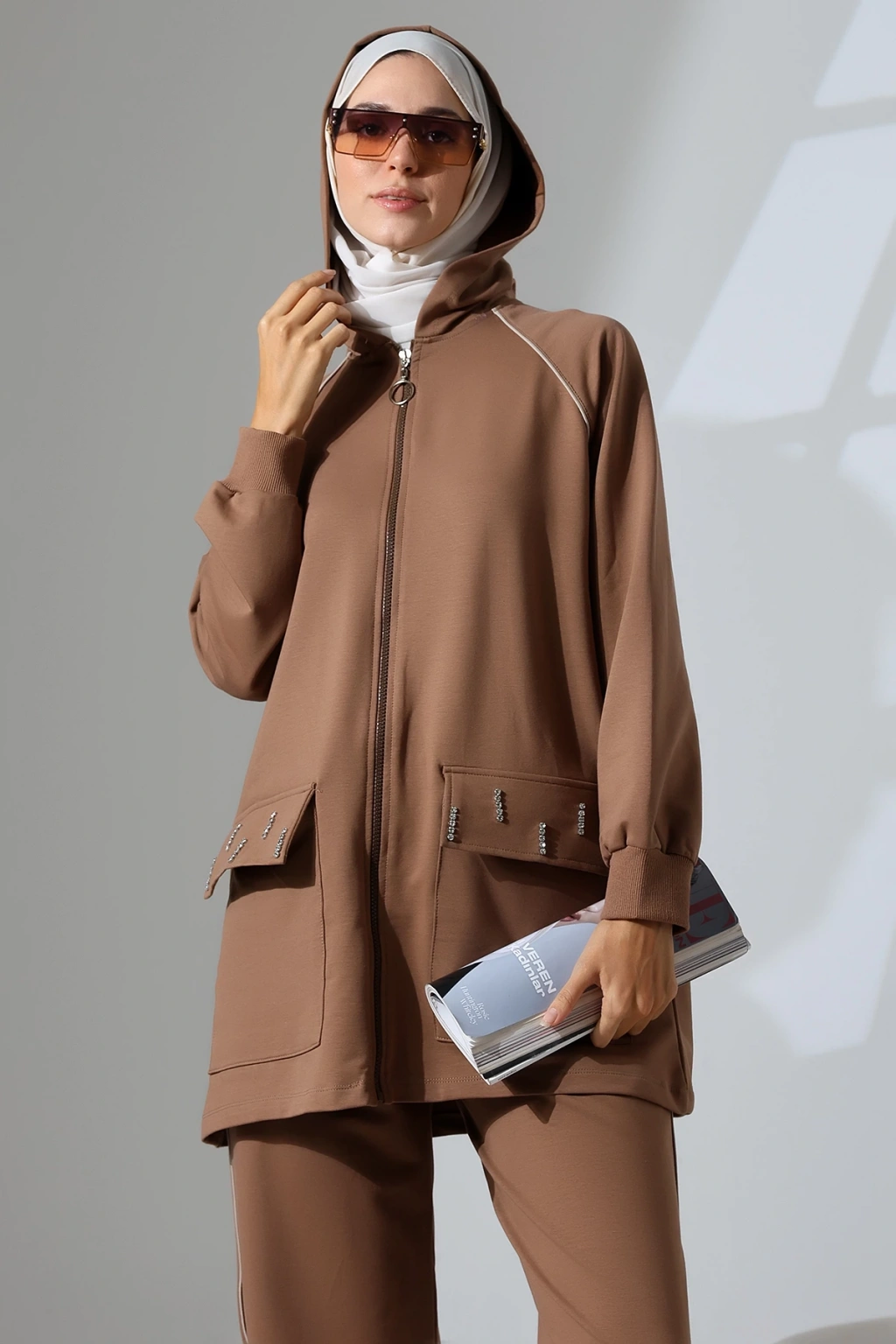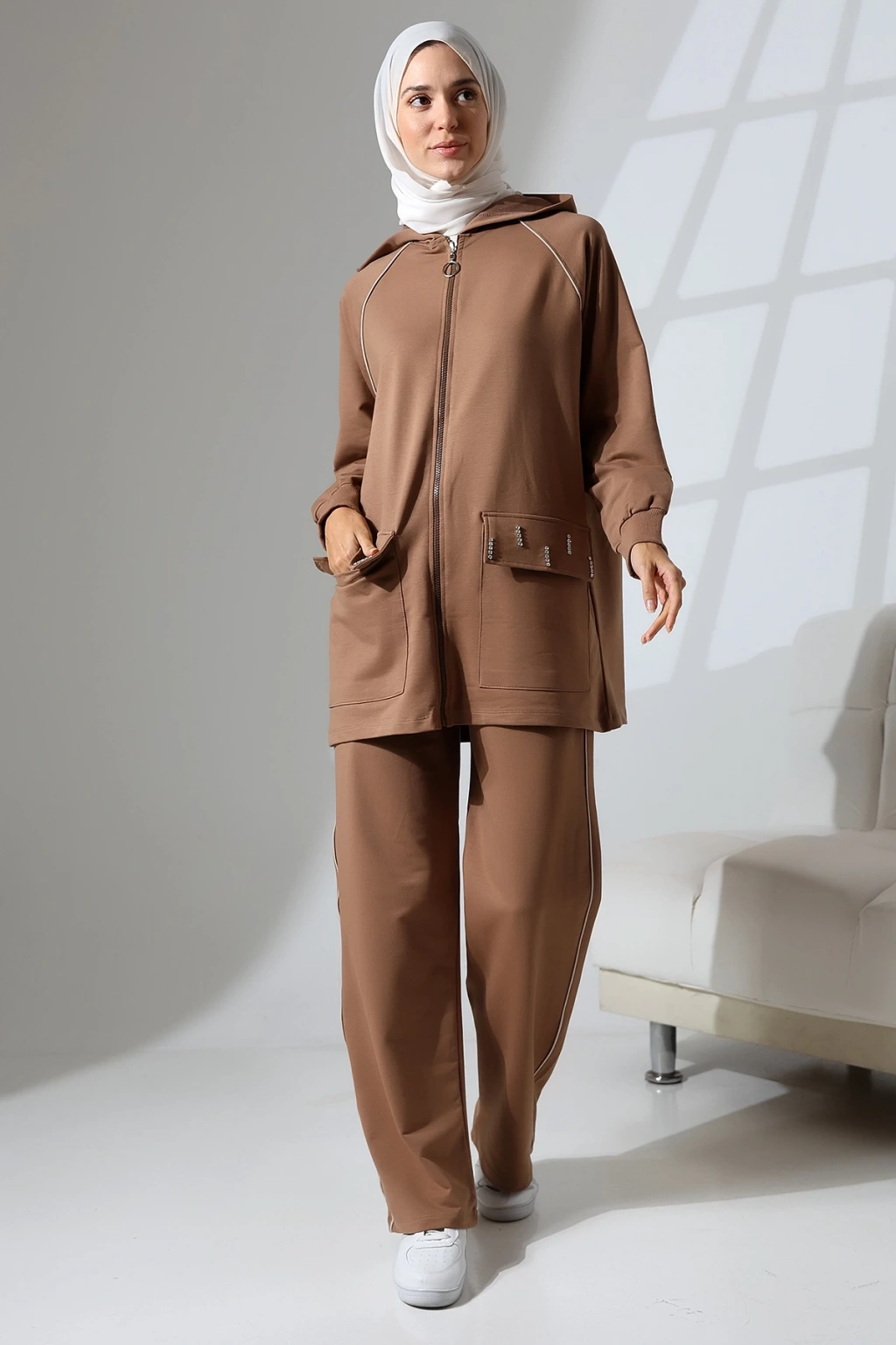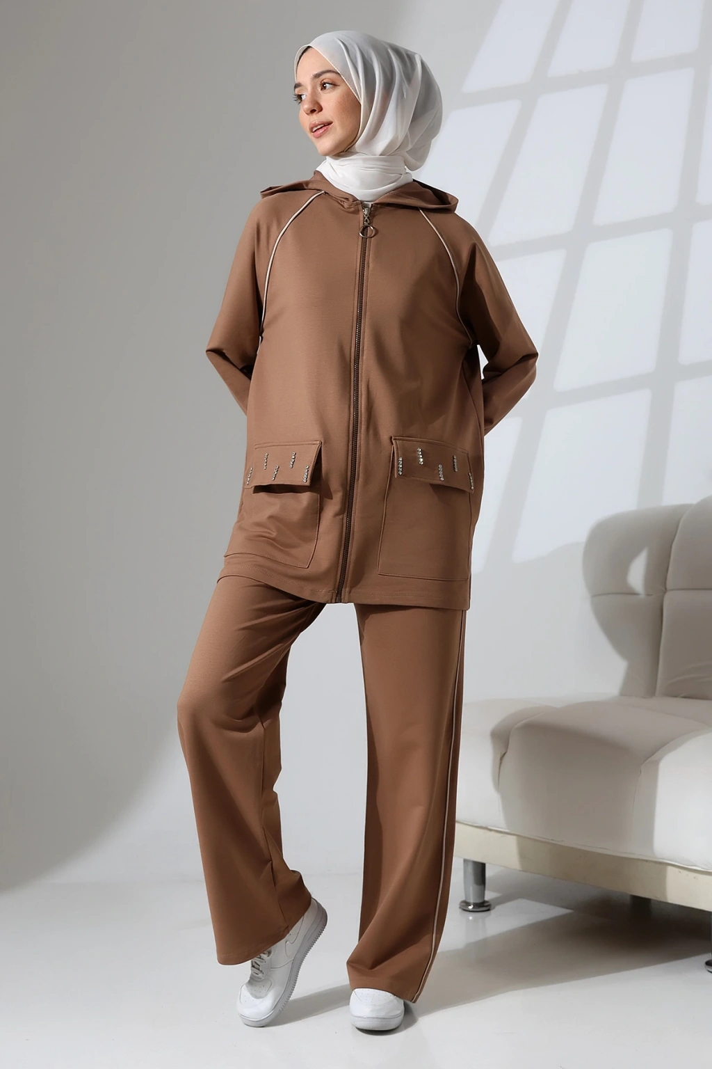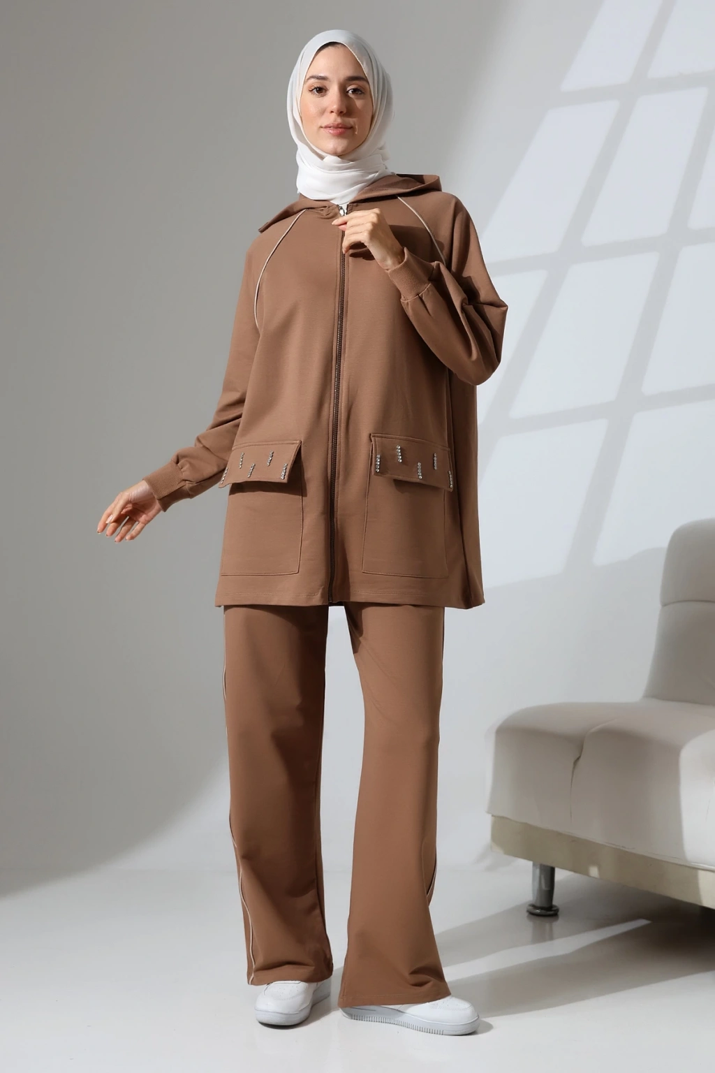 Kadın Kahverengi Mevsimlik Penye Alt Üst Spor Ve Rahat Ikili Tunik Pantolon Şık Tesettür Takım