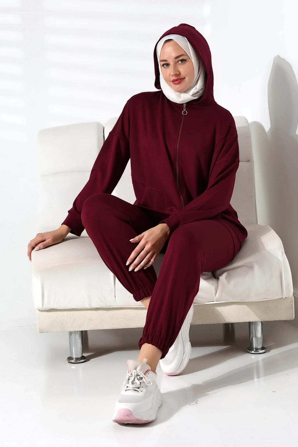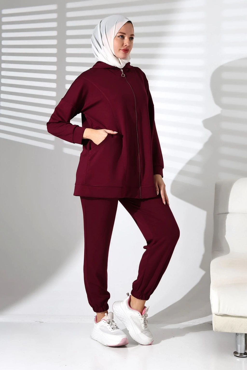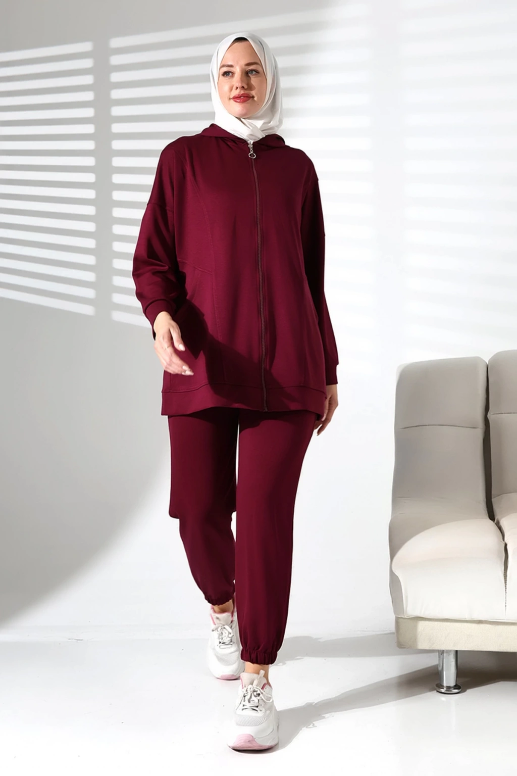 • Mihran Butik'in rahat ve şık alt ve üst spor tesettür takımı, modal penye kumaşıyla dört mevsim boyunca konforlu bir kullanım sunuyor.; Üst parçanın fermuar kapamalı kapüşonlu tasarımı ve cepleri, pratik bir şıklık sağlarken; alt parça ise bel ve paça lastikleriyle günlük hareketlerinize uyum sağlıyor.; Cepli tasarımı sayesinde kullanışlı olan bu takım, sportif ve rahat bir stil arayanlar için mükemmel bir tercih.; • Ürün Özellikleri: Modal penye rahat kumaş, Üst: Fermuar kapamalı, kapüşonlu, Cepli, Alt: Bel ve paça lastikli, cepli, Regular fit, rahat kalıp • Renk Seçenekleri: Mürdüm, Lacivert, Siyah, Haki, Füme • Beden Seçenekleri: S, M, L, XL • Fotoğraftaki model 174 cm boyunda, 85 cm göğüs, 67 cm bel ve 97 cm basen ölçülerine sahip olup, M beden giymektedir.; • Mihran Butik spor tesettür takımı, günlük kombinlerde konfor ve şıklığı bir arada sunar.; Dört mevsim tercih edilebilecek bu takım ile spor tarzınızı kusursuz şekilde tamamlayın.; Şimdi sipariş verin, gardırobunuza sportif bir dokunuş katın! • Ürününüzü daha uzun kullanabilmeniz ve ürününüze uygun bakım yapabilmeniz için lütfen ürün içerisindeki yıkama talimatlarına uyunuz.; • Stüdyo çekimlerinde renkler ışık farklılığından dolayı değişiklik gösterebilir.