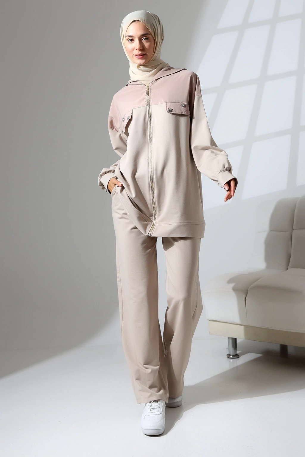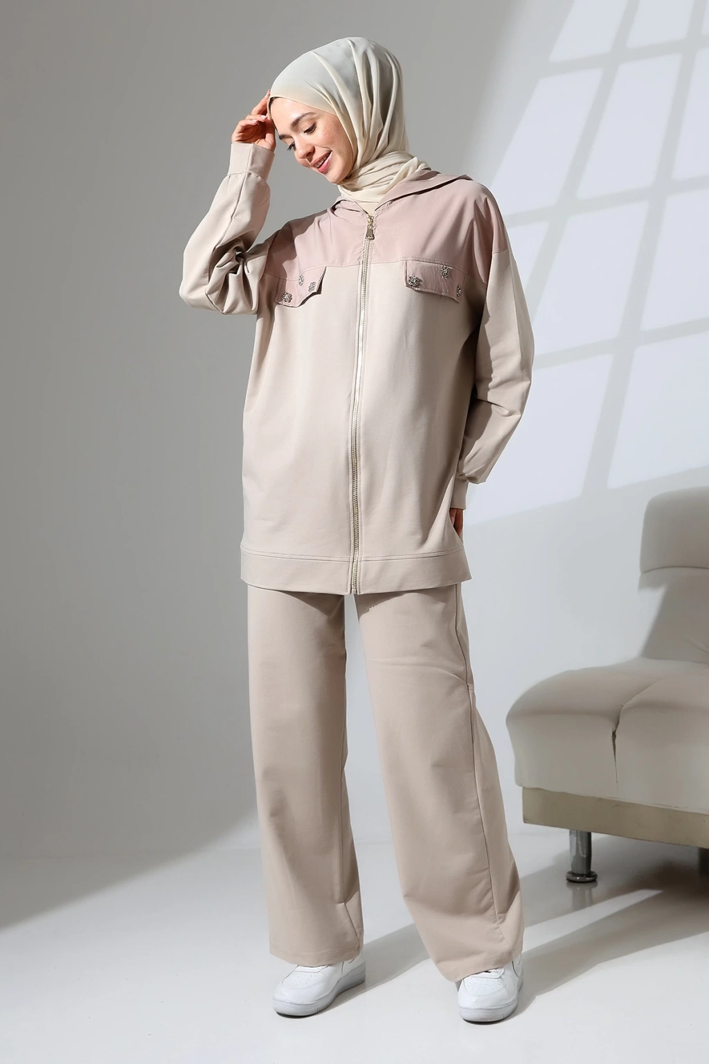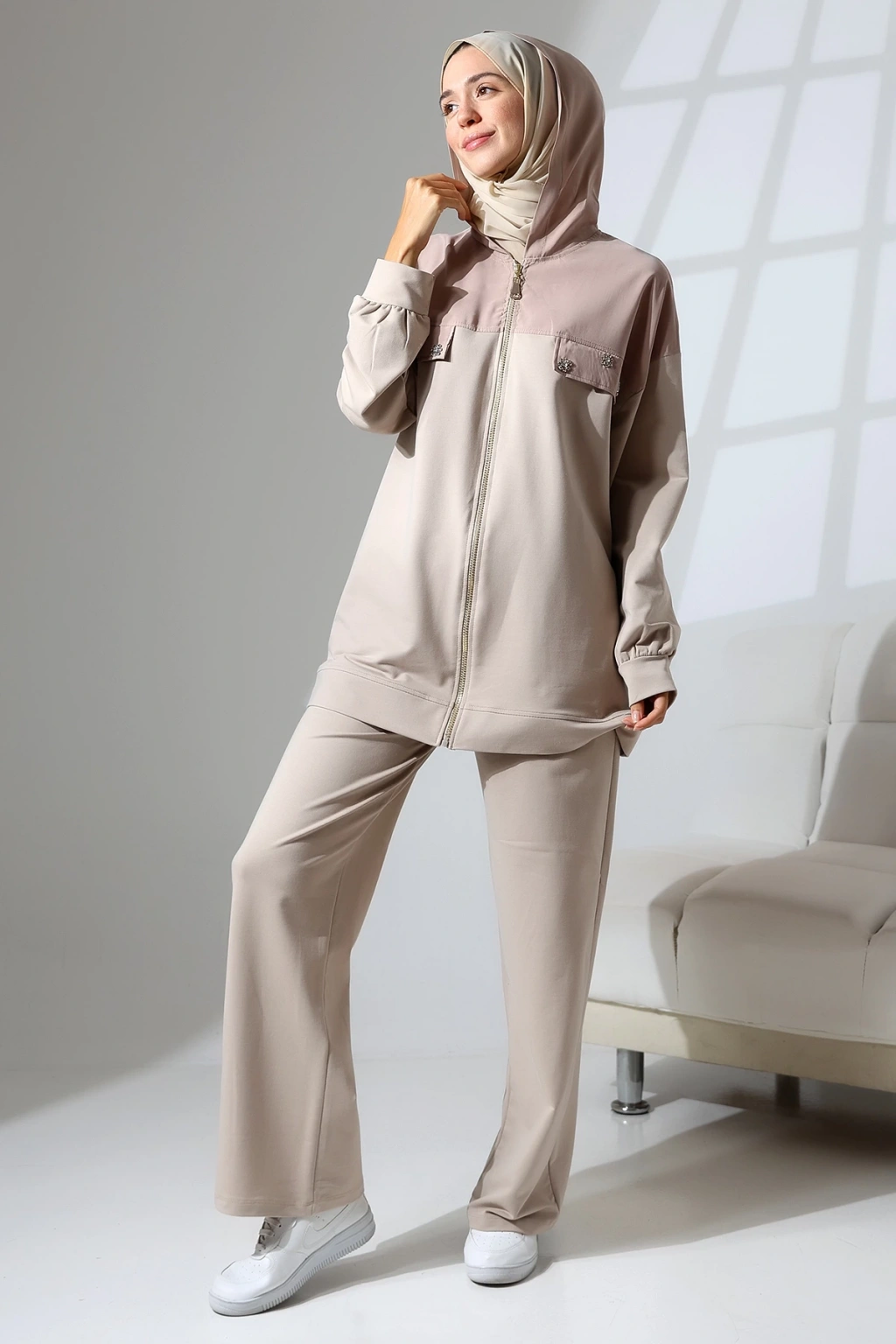 • Kadın Mevsimlik Penye Alt Üst Spor ve Rahat Tesettür Takım • Mihran Butik'in yeni sezon 2 İplik Penye Kumaş Takımı, şıklığı ve rahatlığı bir arada sunar. ; %80 pamuk, %15 polyester ve %5 likra karışımı kumaşı ile dört mevsim boyunca giyilebilir. ; Takım, pantolon ve üst olmak üzere iki parçadan oluşur. ; • Beden Önerisi: 55-62 kg S Beden, 63-70 kg M Beden, 71-80 kg L Beden, 81-90 kg XL Beden • Üst Ürün Detayları: Kapüşonlu ve fermuarlı tasarım, Taş detayları ile şıklık katılmış, İthal kumaş garni detaylı, Pantolon Detayları: Cepli ve beli lastikli rahat kalıp • Manken Bilgileri: Fotoğraftaki mankenin ölçüleri: Boy: 175 cm, Göğüs: 84 cm, Bel: 63 cm, Basen: 90 cm. ; Mankenin giydiği beden: M. ; • Renk Seçenekleri: Haki yeşili, Kahverengi, Camel, Siyah ve Taş rengi • Neden Mihran Butik? Mihran Butik olarak, sizlere en kaliteli kumaşlar ve en şık tasarımları sunmayı hedefliyoruz. ; Rahat kalıpları ve modern tasarımları ile her zevke hitap eden koleksiyonlarımızı keşfetmek için hemen sipariş verin! • Ürününüzü daha uzun kullanabilmeniz ve ürününüze uygun bakım yapabilmeniz için lütfen ürün içerisindeki yıkama talimatlarına uyunuz. ; • Stüdyo çekimlerinde renkler ışık farklılığından dolayı değişiklik gösterebilir.;